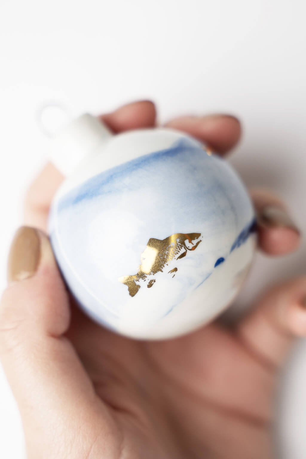 Porcelánová baňka “Kapor” zdobená kobaltovým dekorom a zlatými prvkami, vybavená oceľovým očkom pre jednoduché zavesenie. Každý kus je originál vďaka ručnej výrobe.