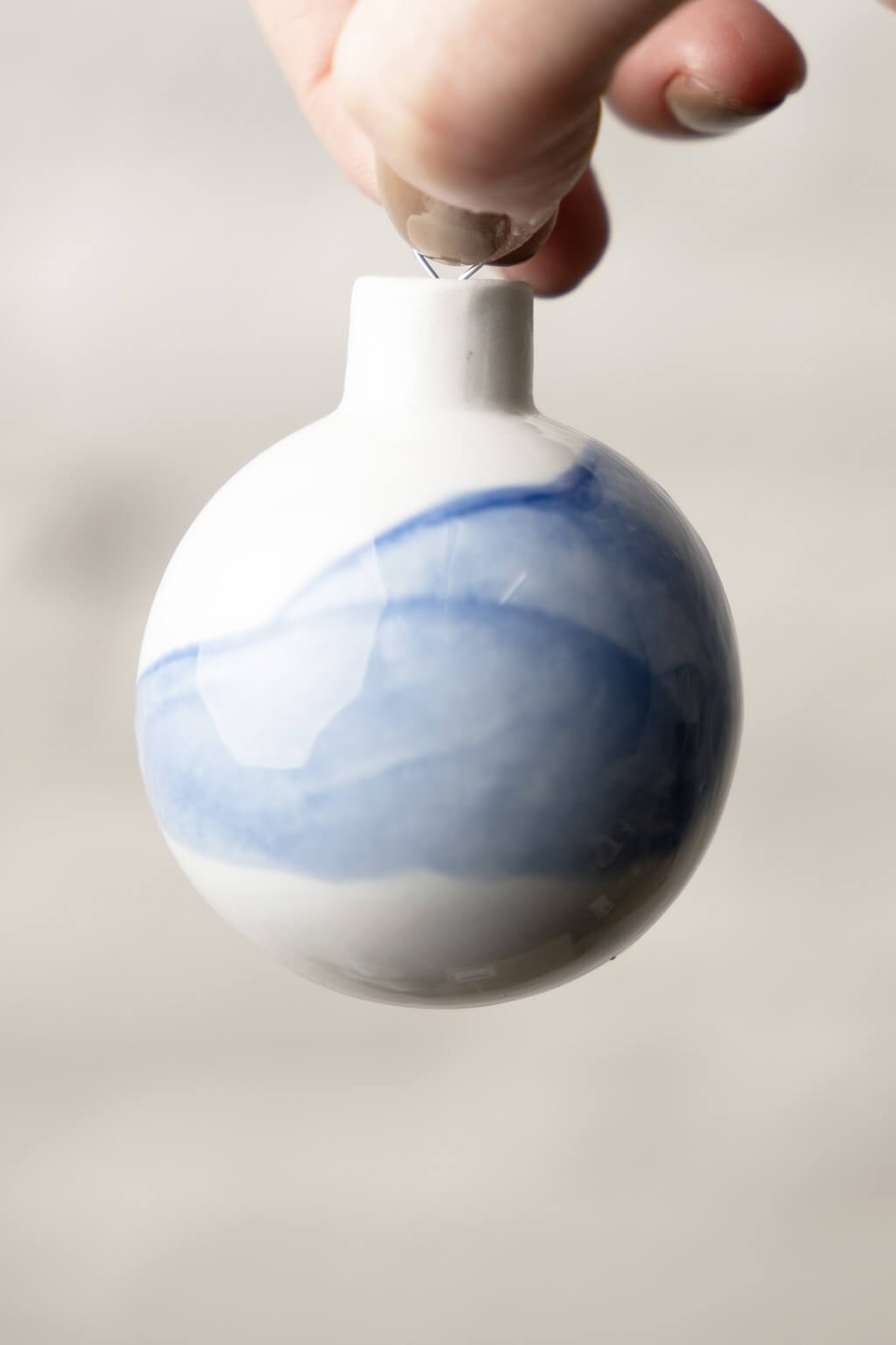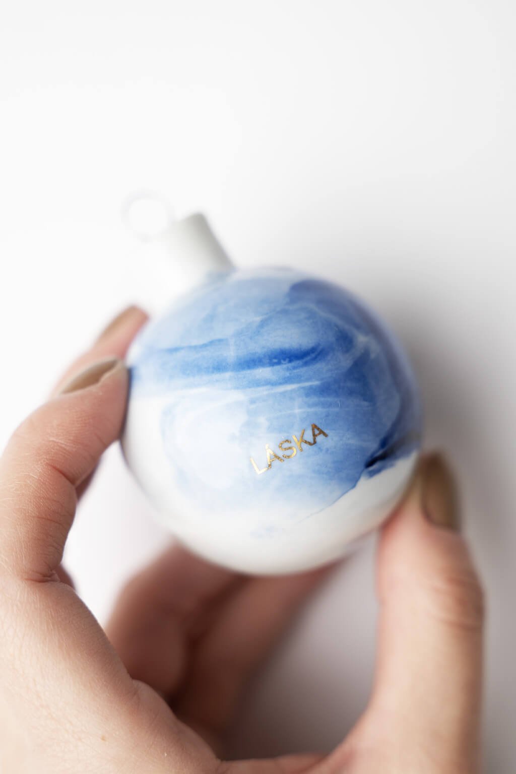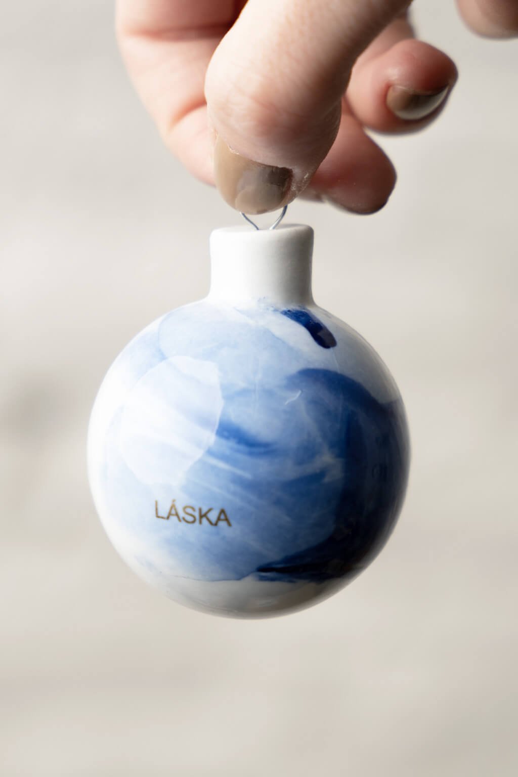 Porcelánová baňka „Láska", ručne zdobená kobaltovým dekorom a jemnými zlatými detailmi. Jedinečný kus, ktorý symbolizuje hlboké emócie a osobné čaro. Vybavená oceľovým očkom pre jednoduché zavesenie.