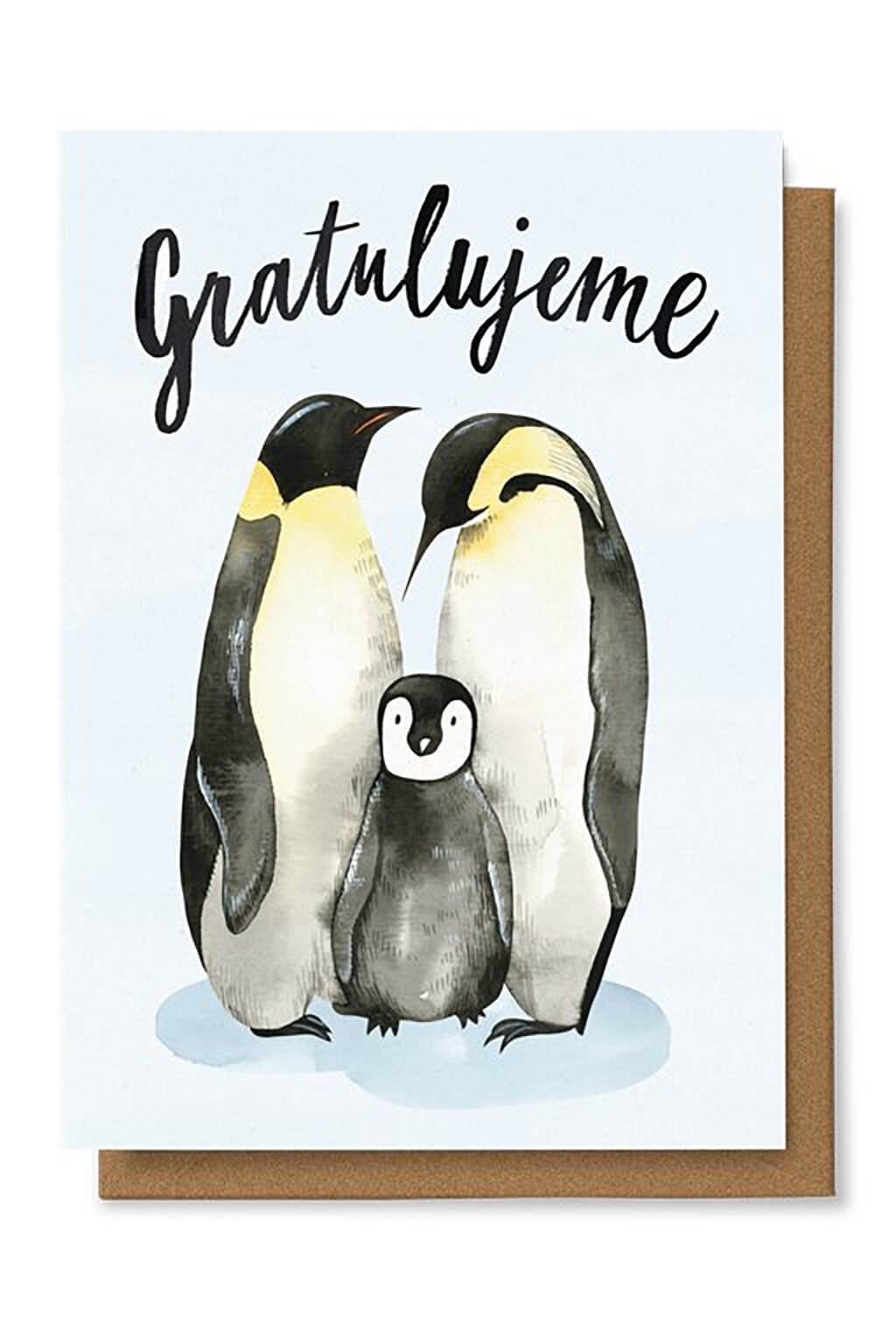 Roztomilé blahoželanie s tučniakmi k novému prírastku do rodinného hniezdočka.