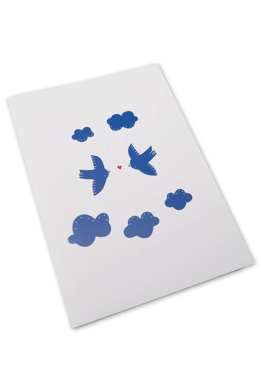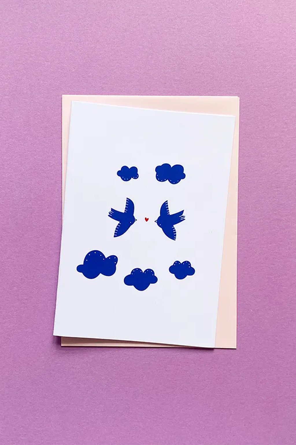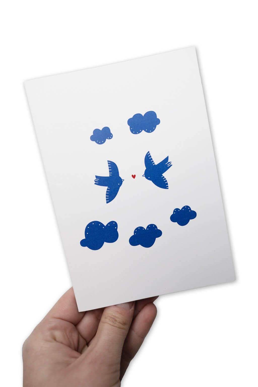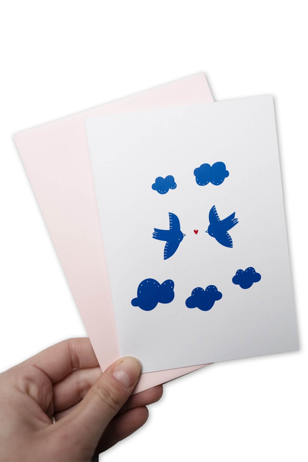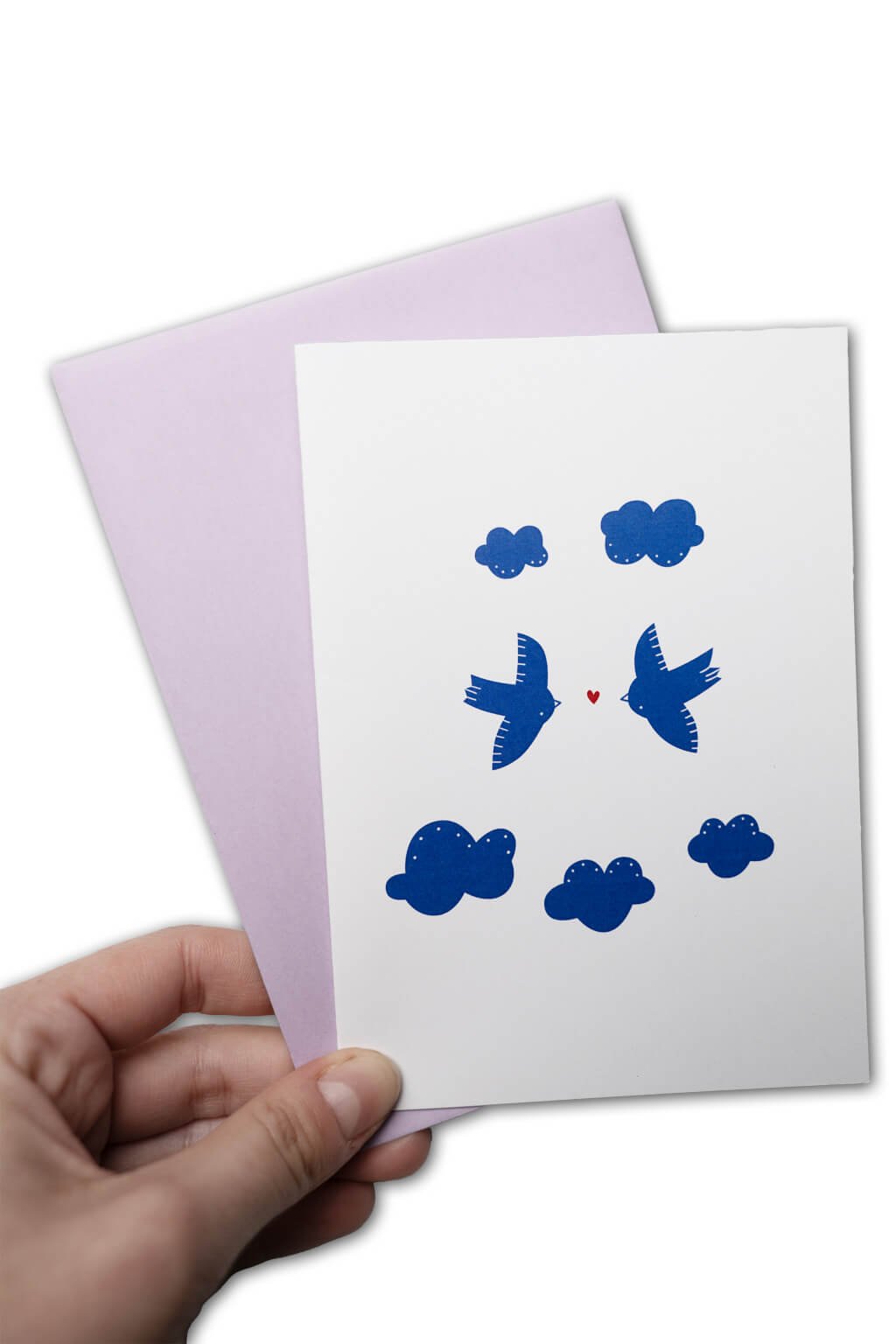 Zaželajte svojim blízkym k ich významnému okamihu jedinečným romantickým prianím zdobeným autorským obrázkom dvoch zaľúbených vtákov na oblohe.