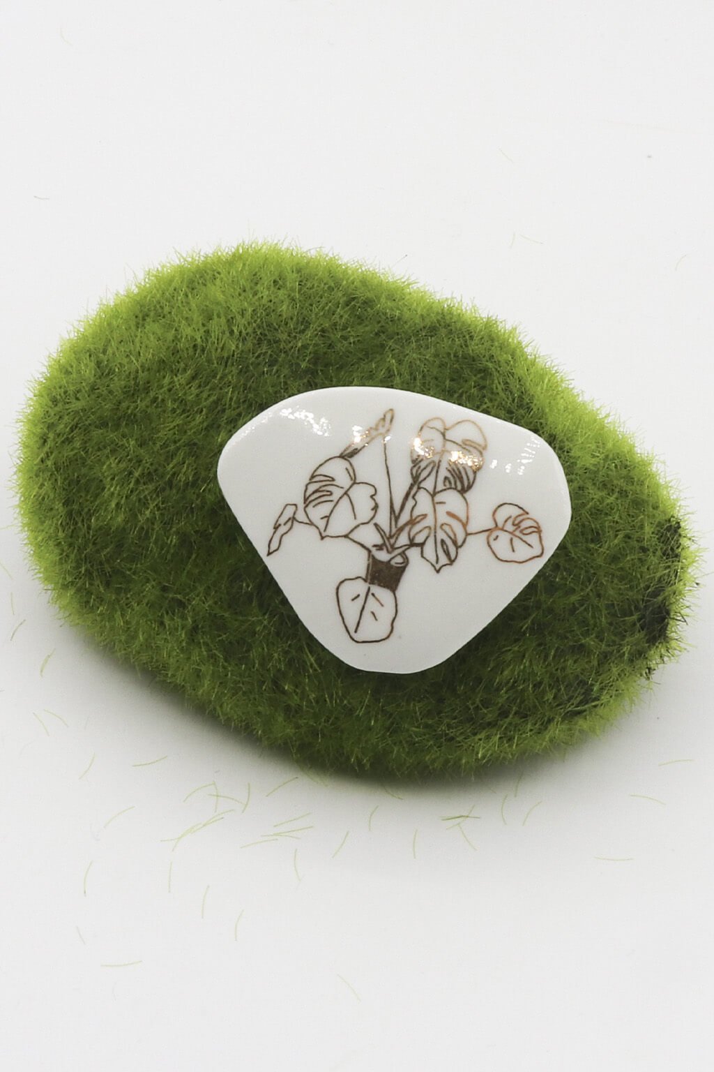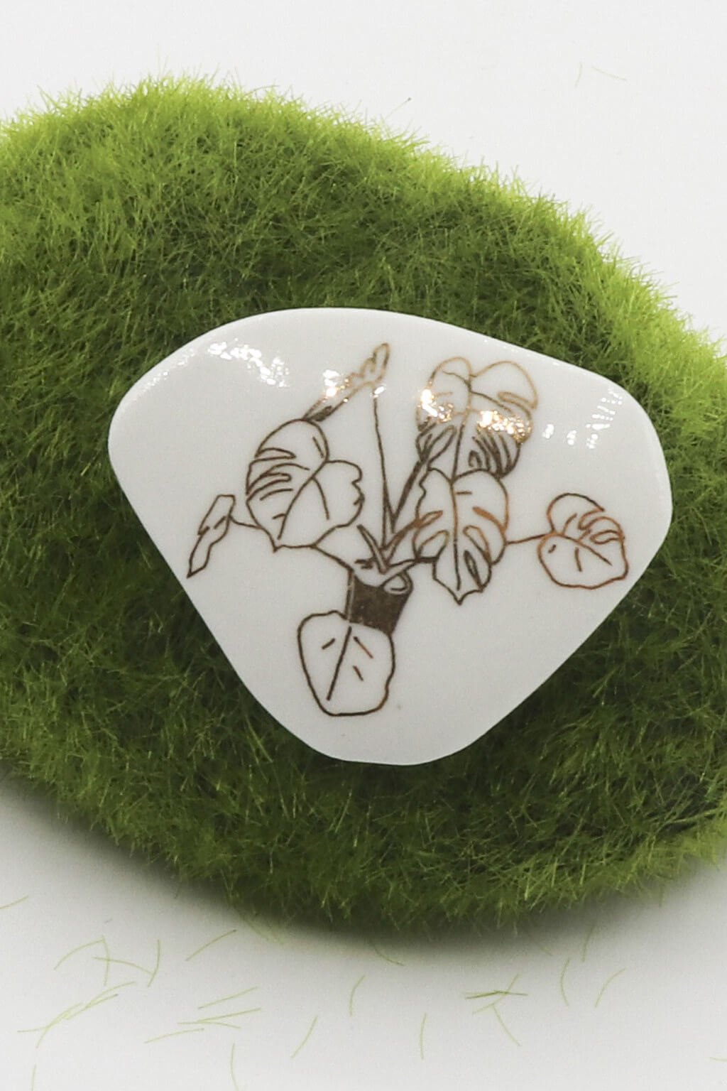 Jemná porcelánová brošňa Monstera, zdobená zlatou kresbou, dodá vášmu outfitu nádych luxusu a originality.