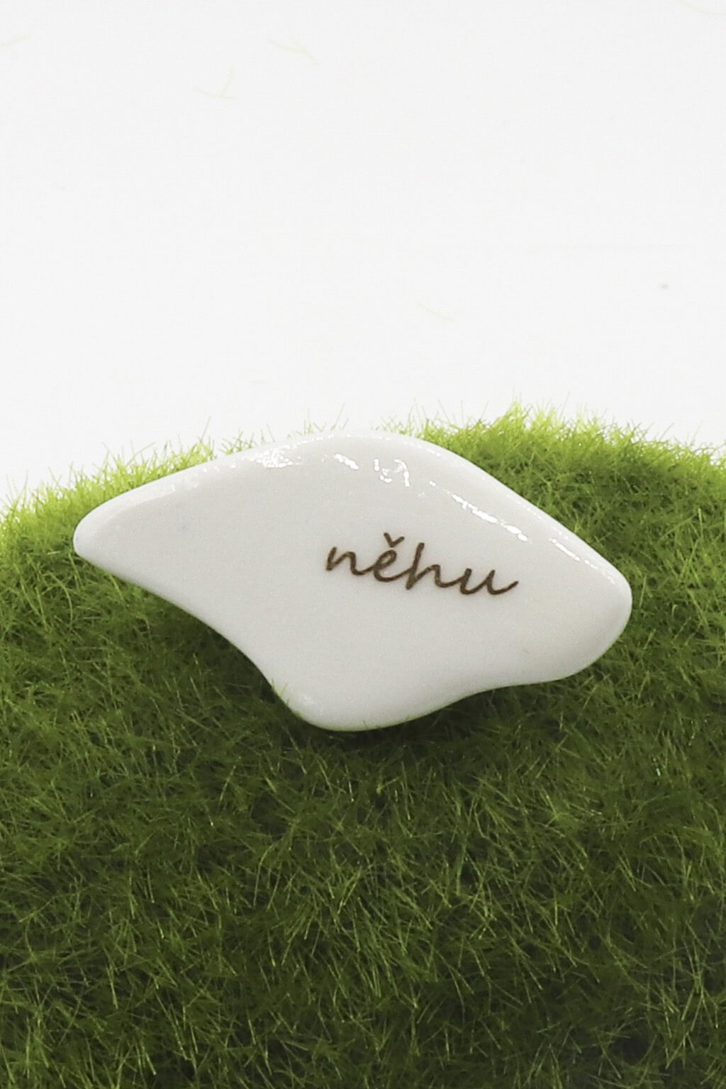 Jemná porcelánová brošňa Nehu, zdobená zlatým textom, dodá vášmu outfitu nádych luxusu a originality.