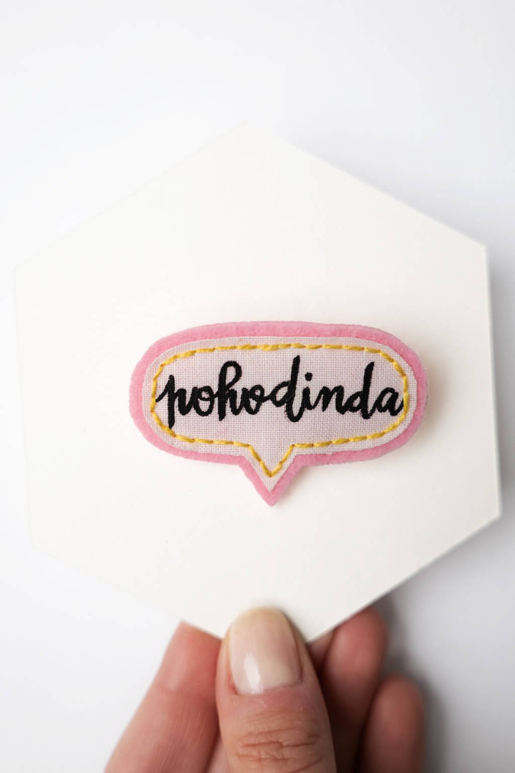 Základom brošne je farebná plsť o hrúbke 3 mm. Na ňu je prišitá bavlnená látka s ručne písaným textom. Všetko je pevne pripevnené k brošňovému mostíku.