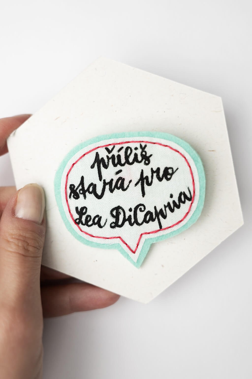 Podkladom brošne je 3mm hrubá farebná plsť, text je ručne písaný na bavlnenú látku, všetko je prišité k brošňovému mostíku.