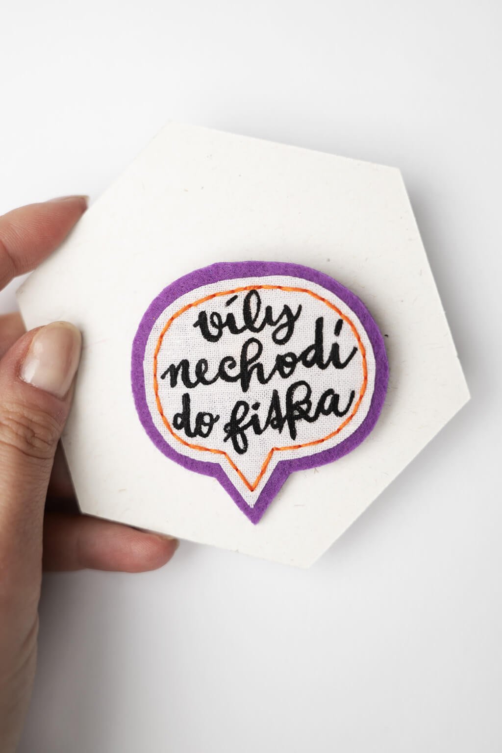 Podkladom brošne je 3mm hrubá farebná plsť, text je ručne písaný na bavlnenú látku, všetko je prišité k brošňovému mostíku.