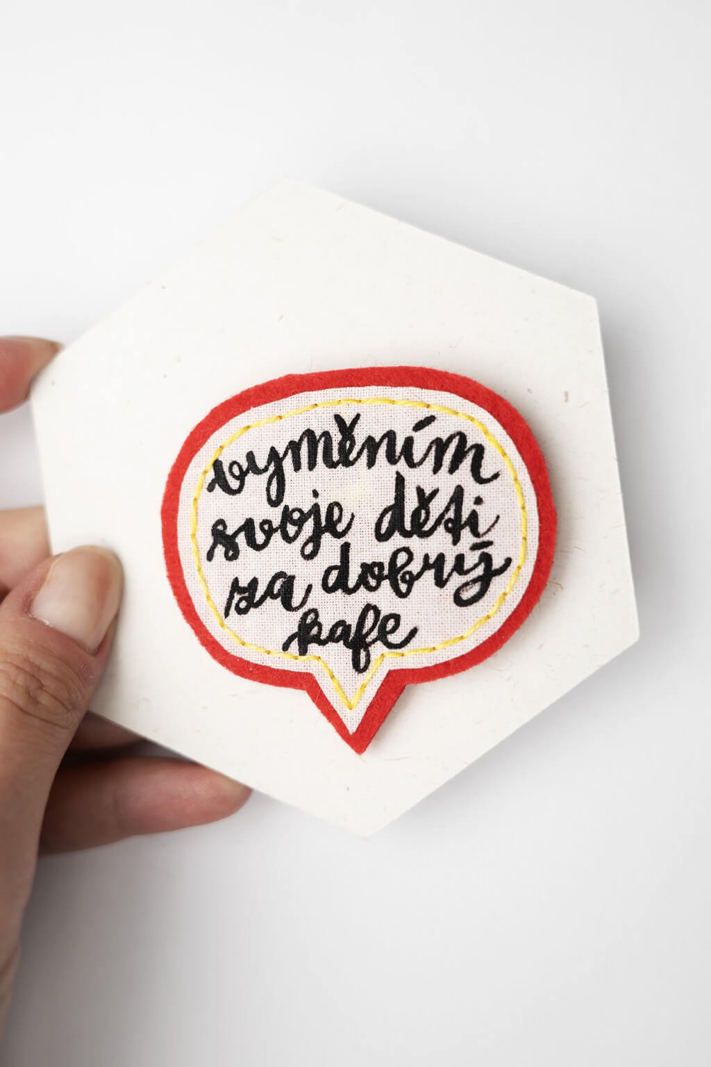 Podkladom brošne je 3mm hrubá farebná plsť, text je ručne písaný na bavlnenú látku, všetko je prišité k brošňovému mostíku.