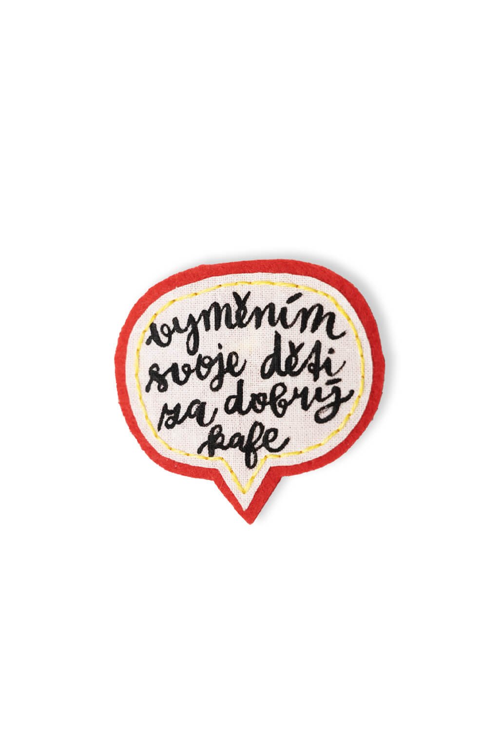 Základom brošne je farebná plsť o hrúbke 3 mm. Na ňu je prišitá bavlnená látka s ručne písaným textom. Všetko je pevne pripevnené k brošňovému mostíku.