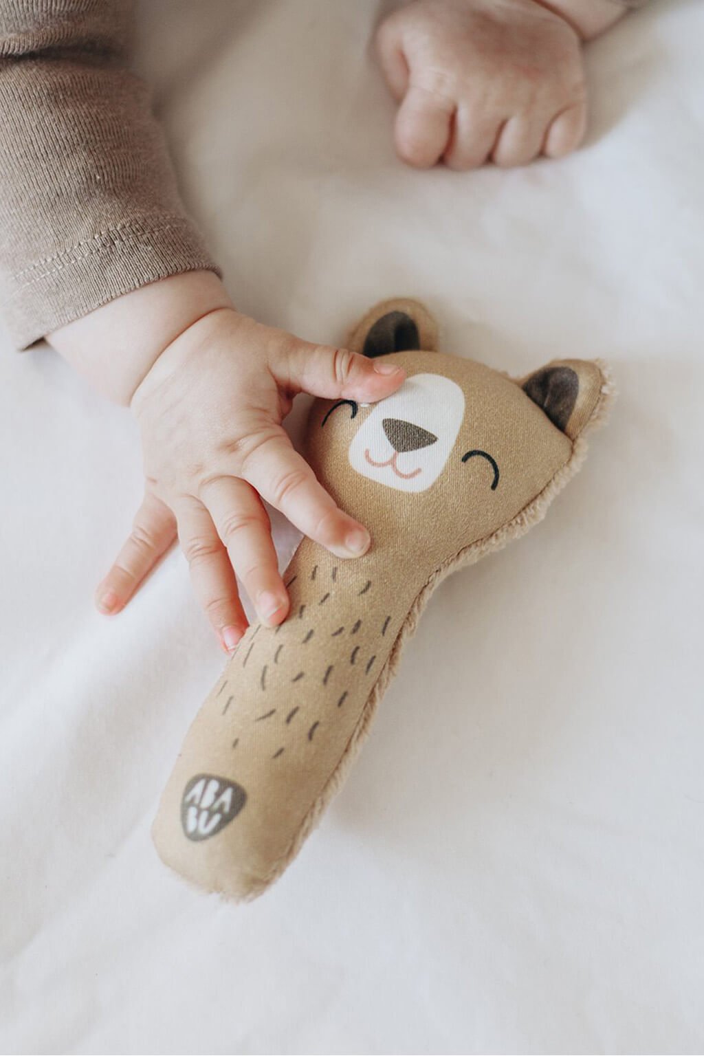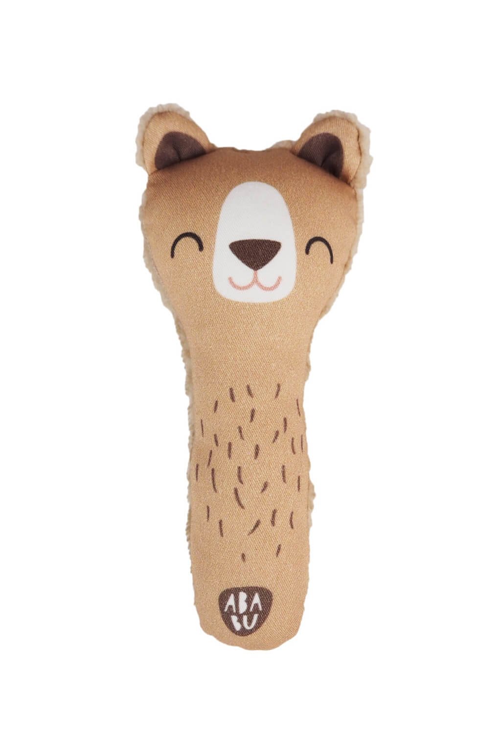 Na zadnej strane hrkálka sa nachádza pútko, ktoré umožňuje jednoduché pripevnenie na hrazdičku alebo ku kočíku. Šnúrka je umiestnená vzadu tak, aby bola hračka vyvážená a pozerala priamo na bábätko. Zadná strana vyrobená z bambusového hebkého froté je mimoriadne savá a efektívne odvádza vlhkosť pri ocucávaní. Bambus má prirodzené antiseptické vlastnosti a rýchloschnúcu povahu. Hračka je dodávaná voľne na darčekovom závesnom kartóne.