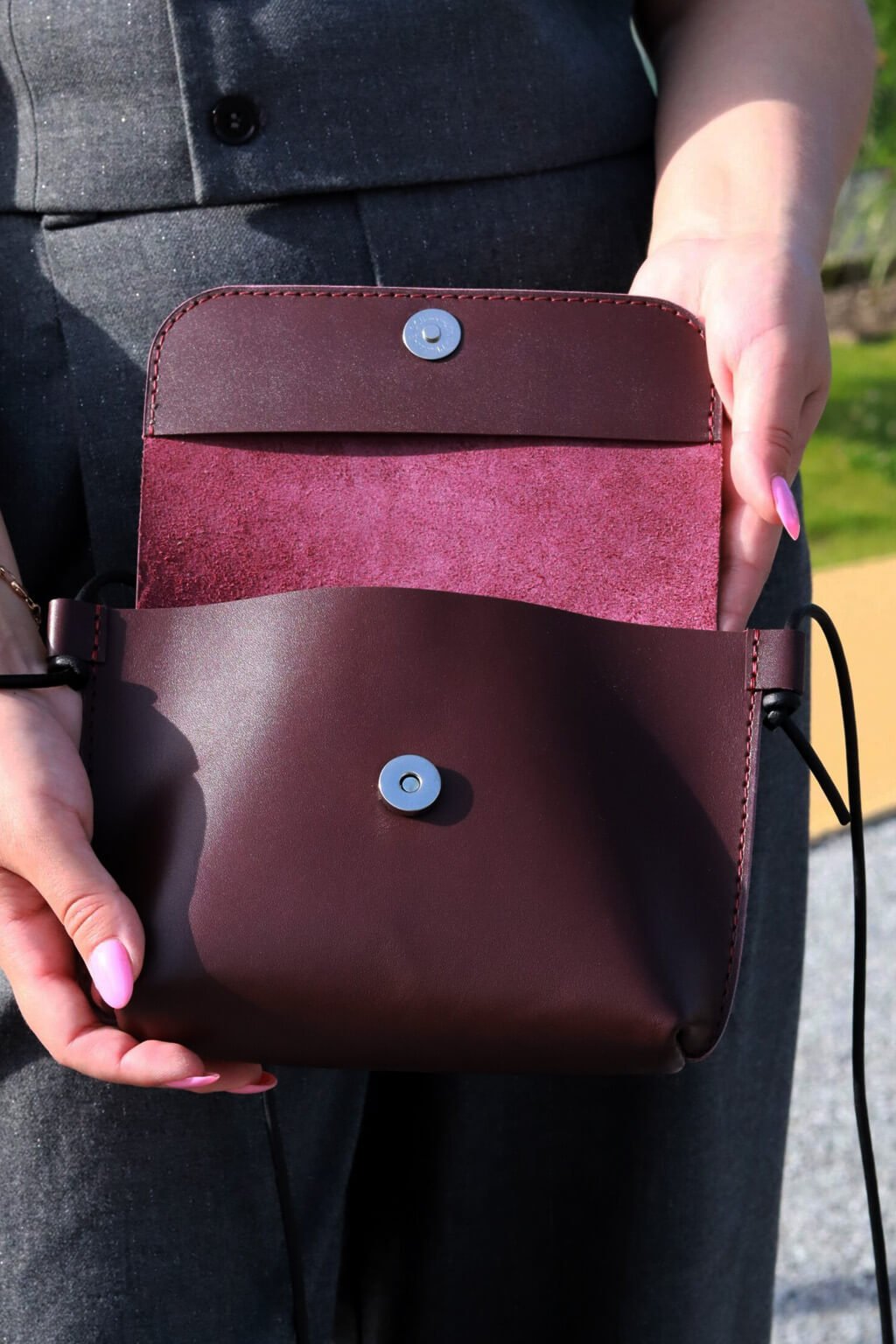 Menšia kožená kabelka ideálna na peňaženku, mobil a kľúče.