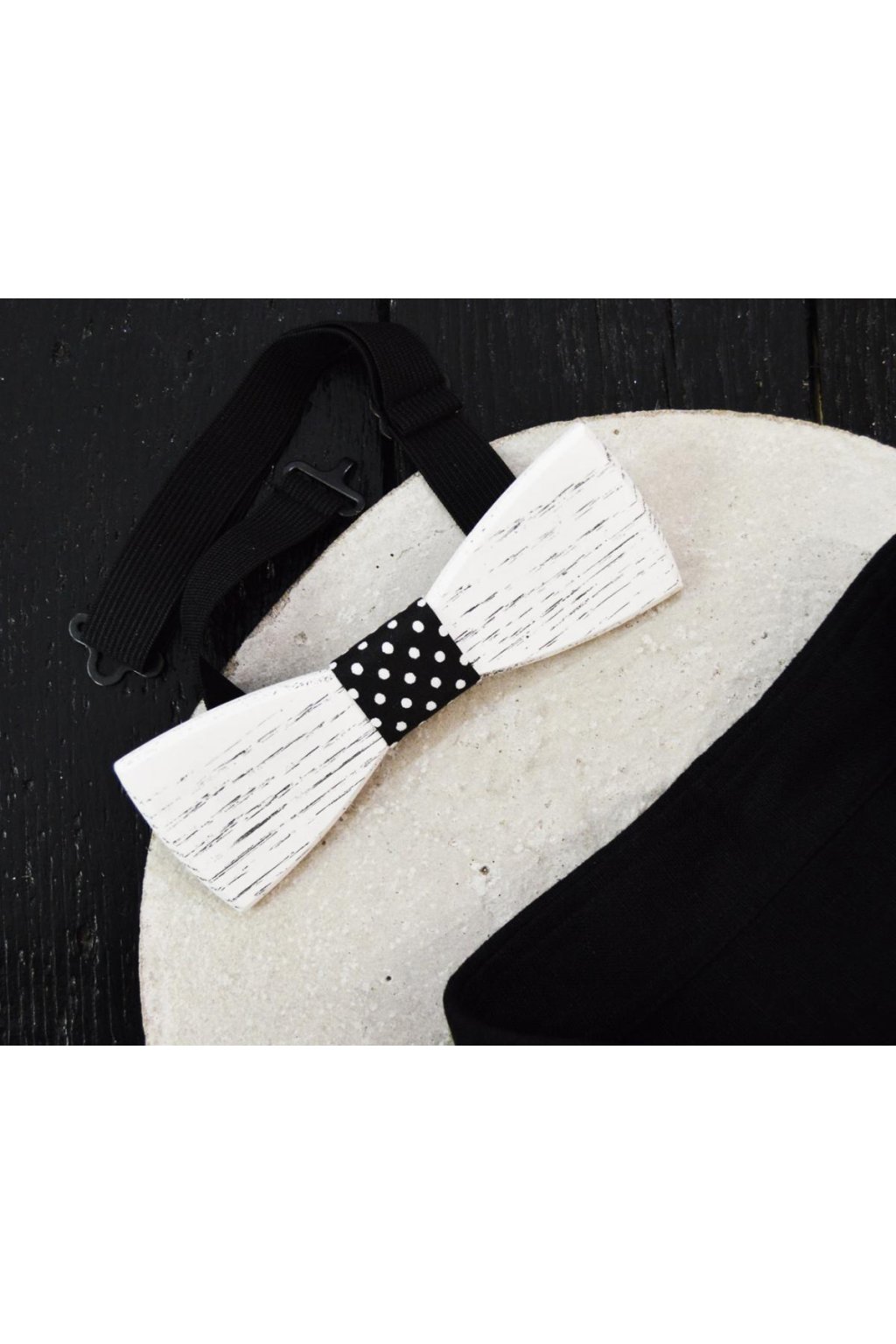 Drevený motýlik - biely, žíhaný s čiernym viazaním s bielymi bodkami