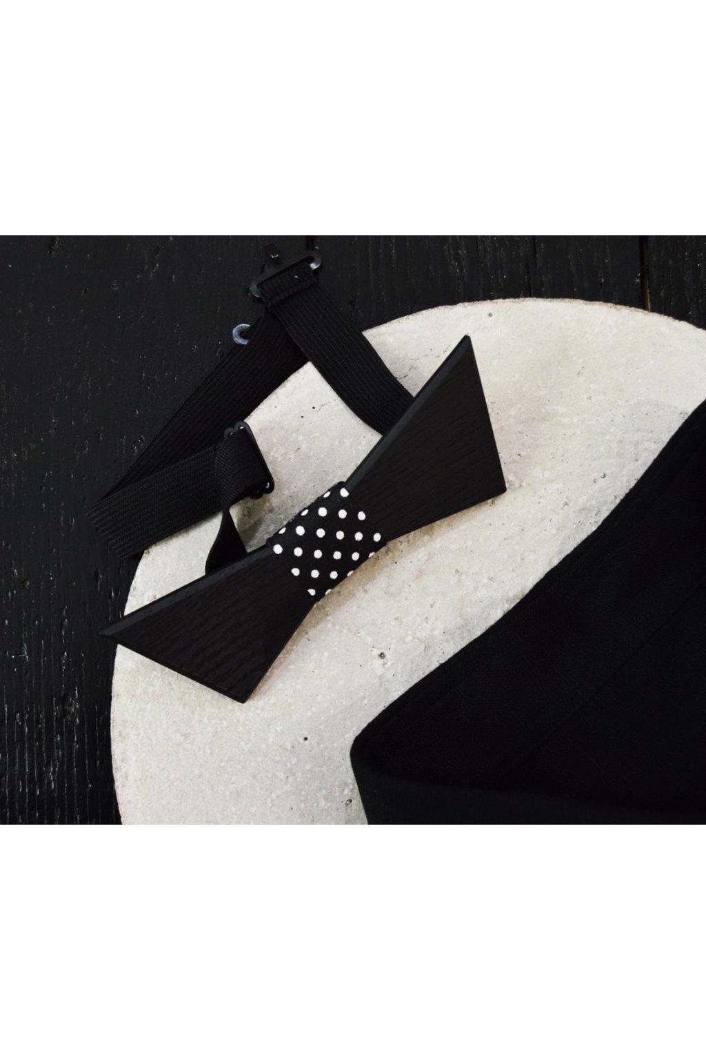 Drevený motýlik - čierny s čiernou viazačkou s bielymi bodkami