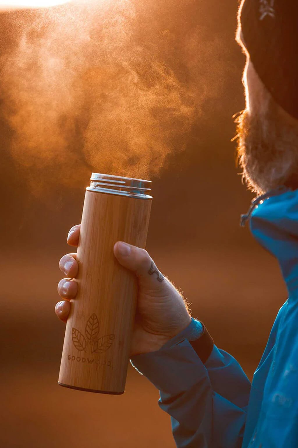 GoodWood termofľaša je vhodná pre všetkých dobrodruhov, ktorým záleží na funkčnosti a zároveň krásnom dizajne. Rovnako ako GoodGlass je vyrobená z čistých prírodných materiálov, ktorými sú prírodný bambus a dvojitá vrstva nehrdzavejúcej ocele s vákuovou izoláciou. Vďaka tomu je bambusová fľaša GoodWood ultraľahká a hodí sa tak aj do situácií, kedy na váhe naozaj záleží. Navyše skvele udrží tvoj nápoj v požadovanej teplote po dlhšiu dobu, či už vyrážaš na výlet do prírody, do mesta, alebo chceš mať svoj teplý nápoj neustále po ruke!
