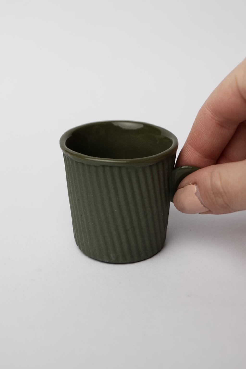 Keramický hrnček na espresso s machovo zelenou matnou glazúrou a jemne vrúbkovaným povrchom od značky Moo Ceramics.