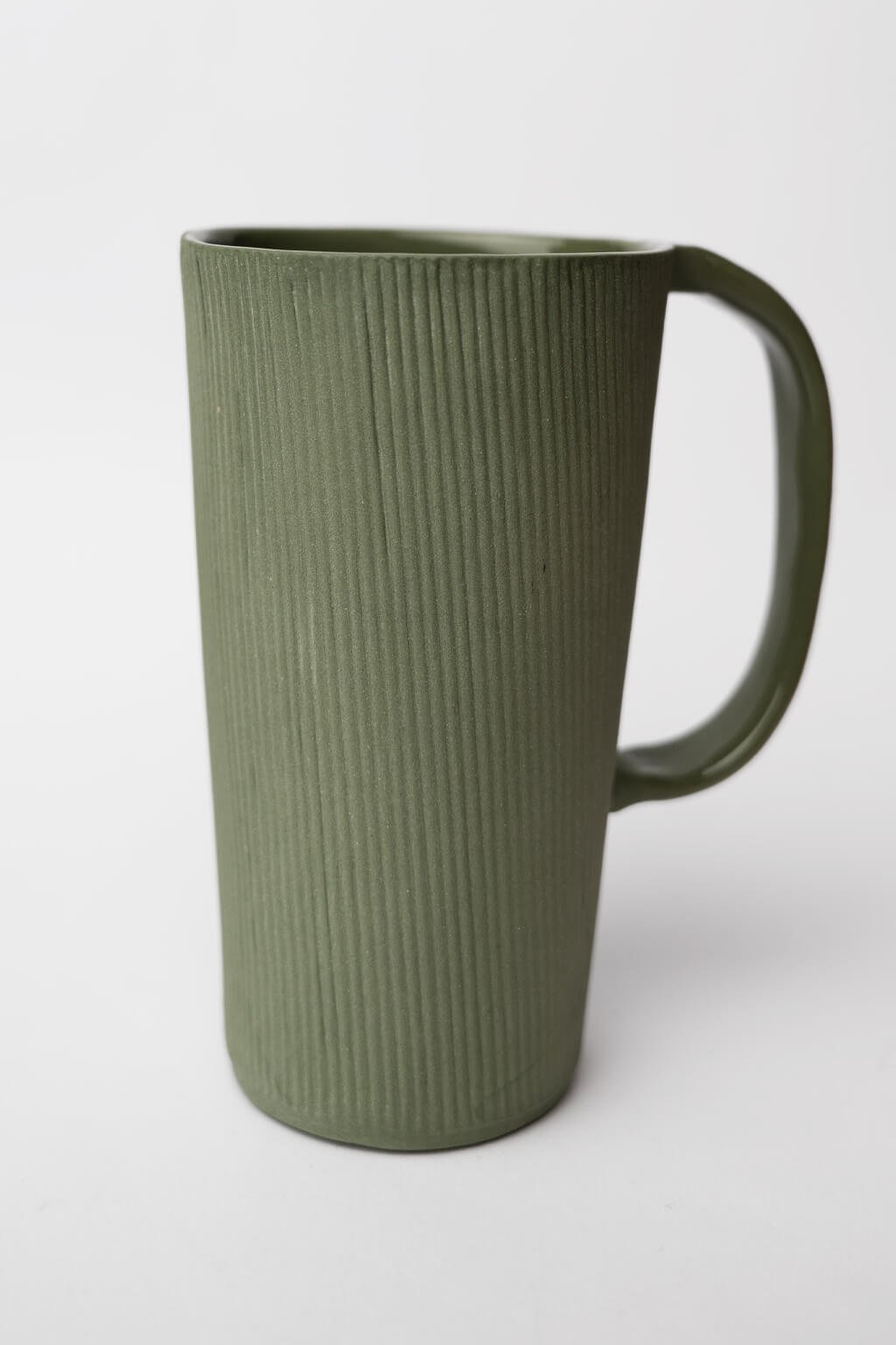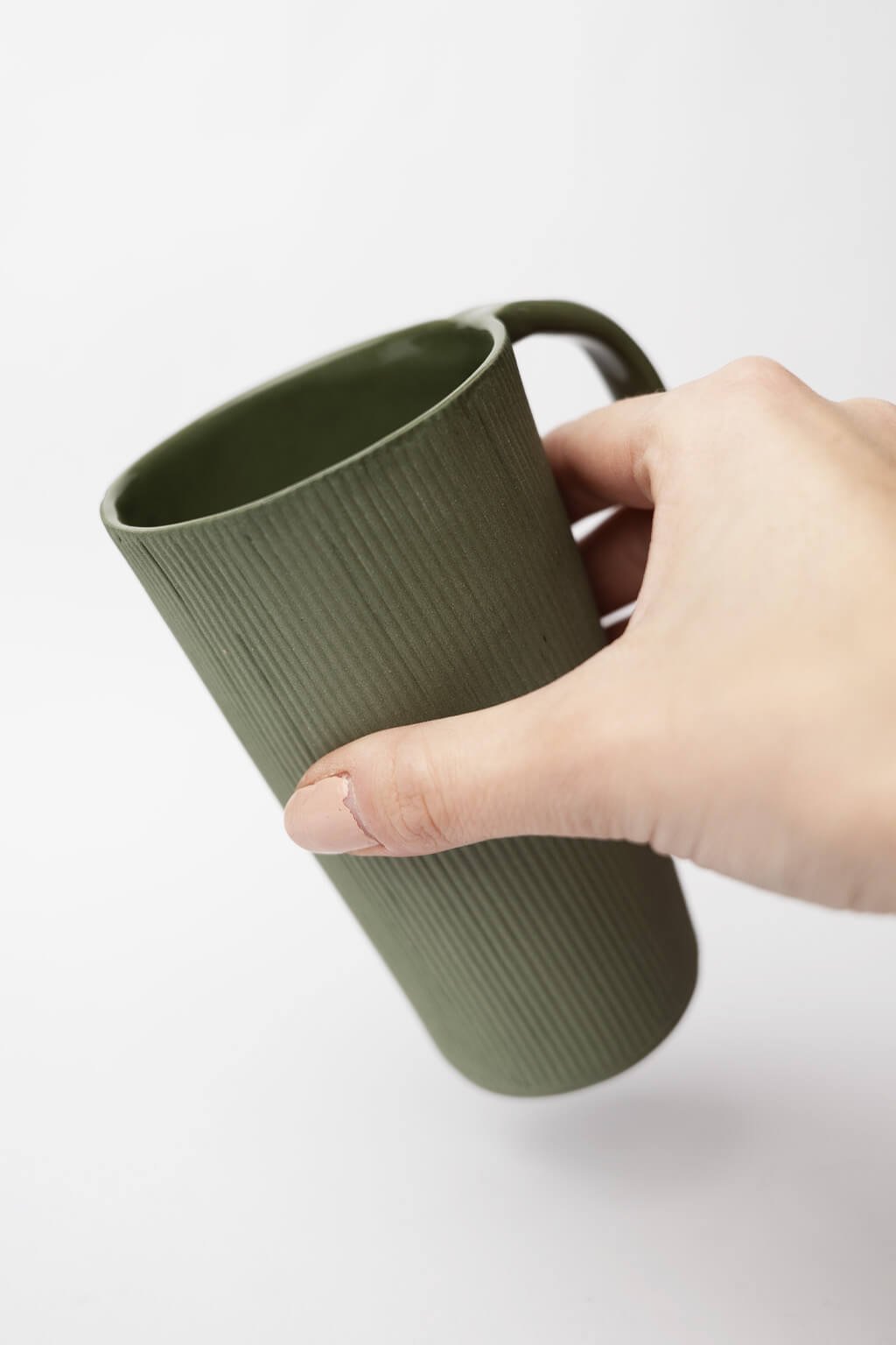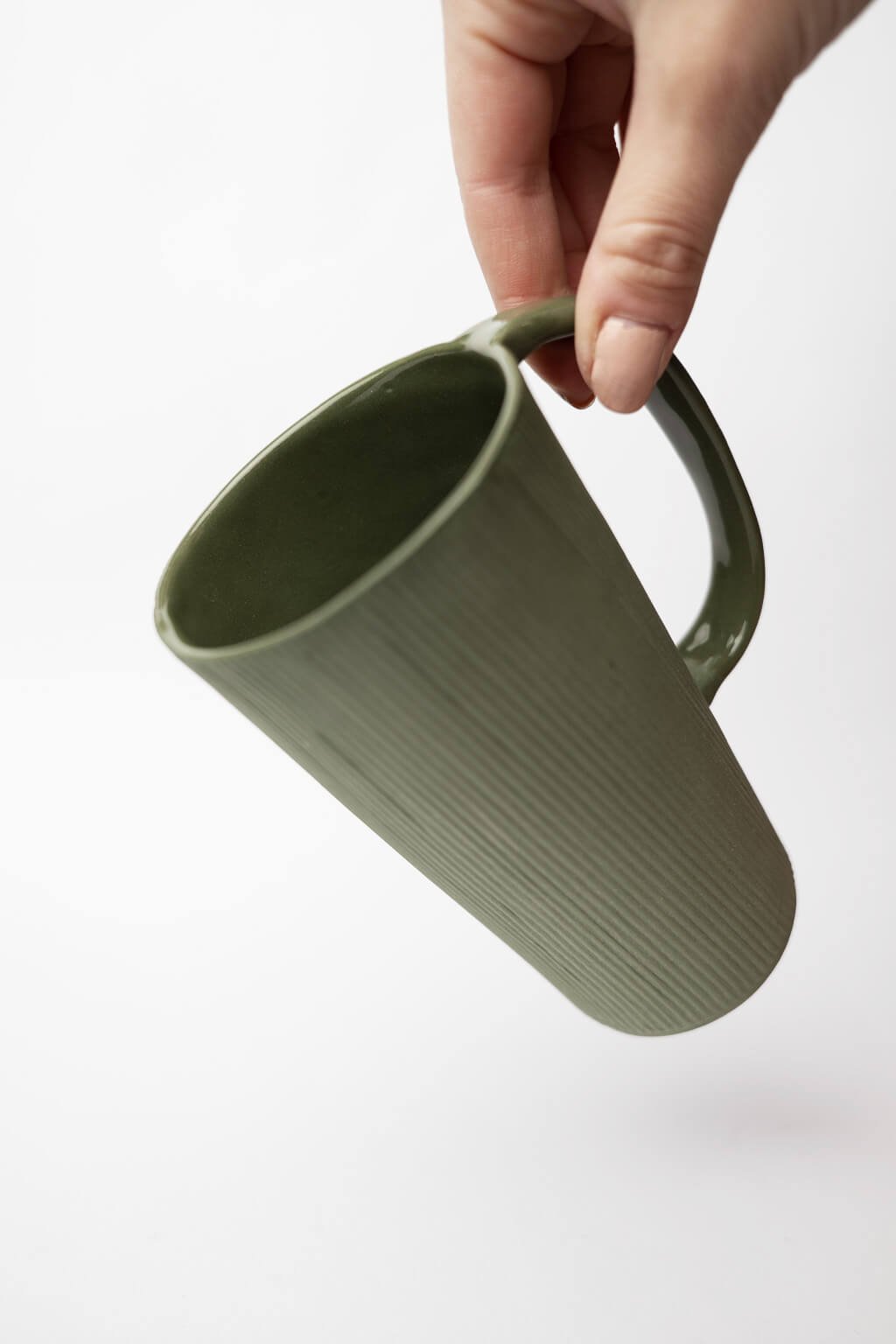 Keramický hrnček s nežnou matnou zelenou glazúrou a jedinečnou vrúbkovanou textúrou prináša do každého dňa dotyk originality a vkusu. Lesklé ucho hrnčeka pôsobí luxusne a dodáva mu šmrnc, vďaka čomu bude ozdobou akéhokoľvek stola. Hrnček je vyrobený z kvalitnej keramiky, čo zaručuje príjemný pocit pri držaní a dlhú životnosť.