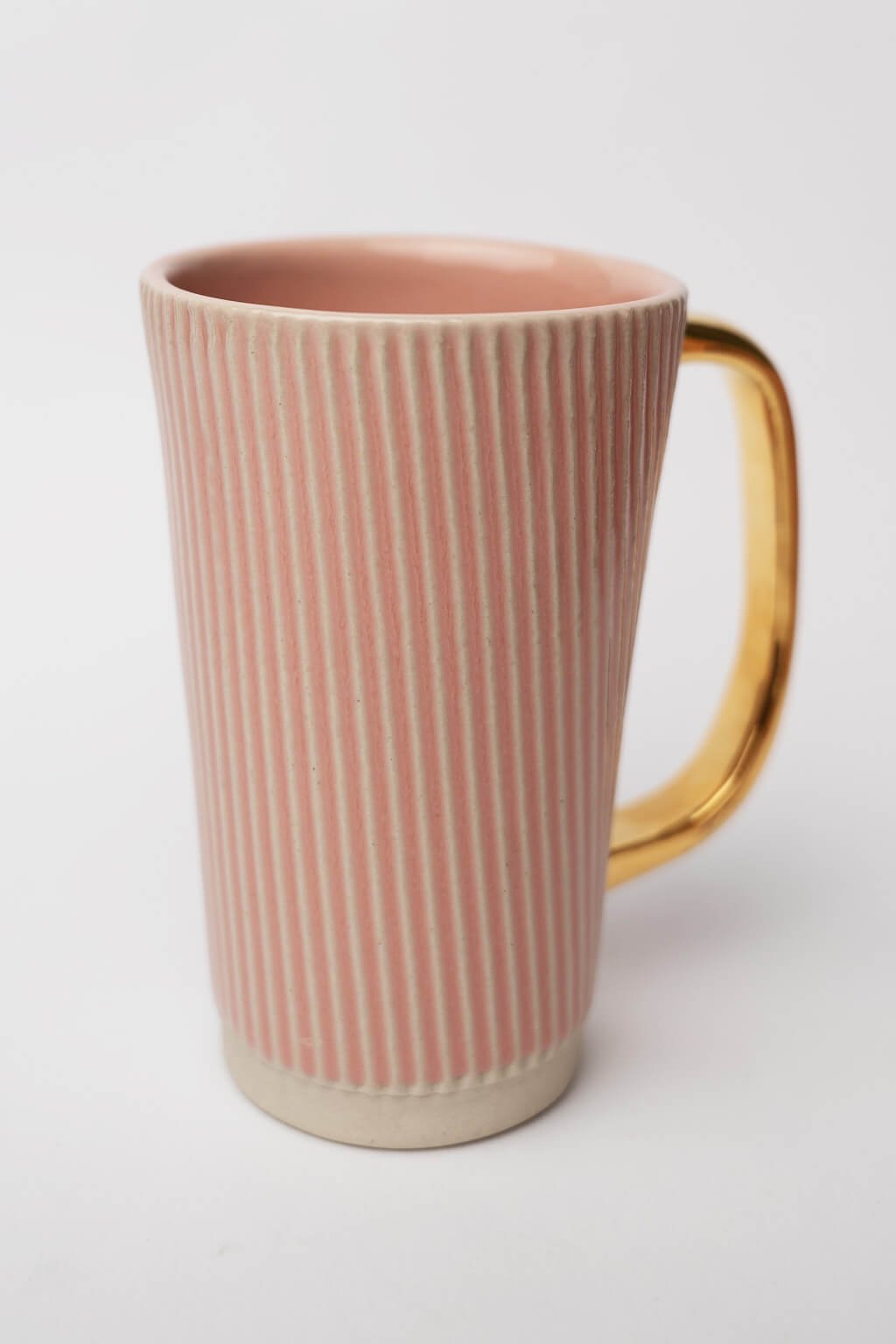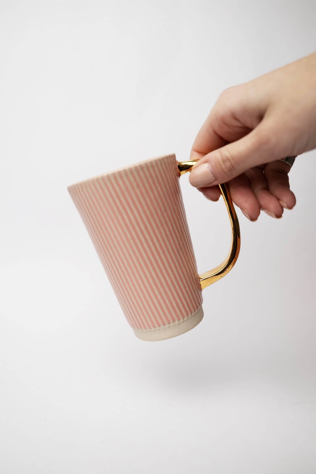 Keramický hrnček s nežnou ružovou glazúrou a jedinečnou vrúbkovanou textúrou prináša do každého dňa dotyk originality a vkusu. Zlaté ucho hrnčeka pôsobí luxusne a dodáva mu šmrnc, vďaka čomu bude ozdobou akéhokoľvek stola. Hrnček je vyrobený z kvalitnej keramiky, čo zaručuje príjemný pocit pri držaní a dlhú životnosť.