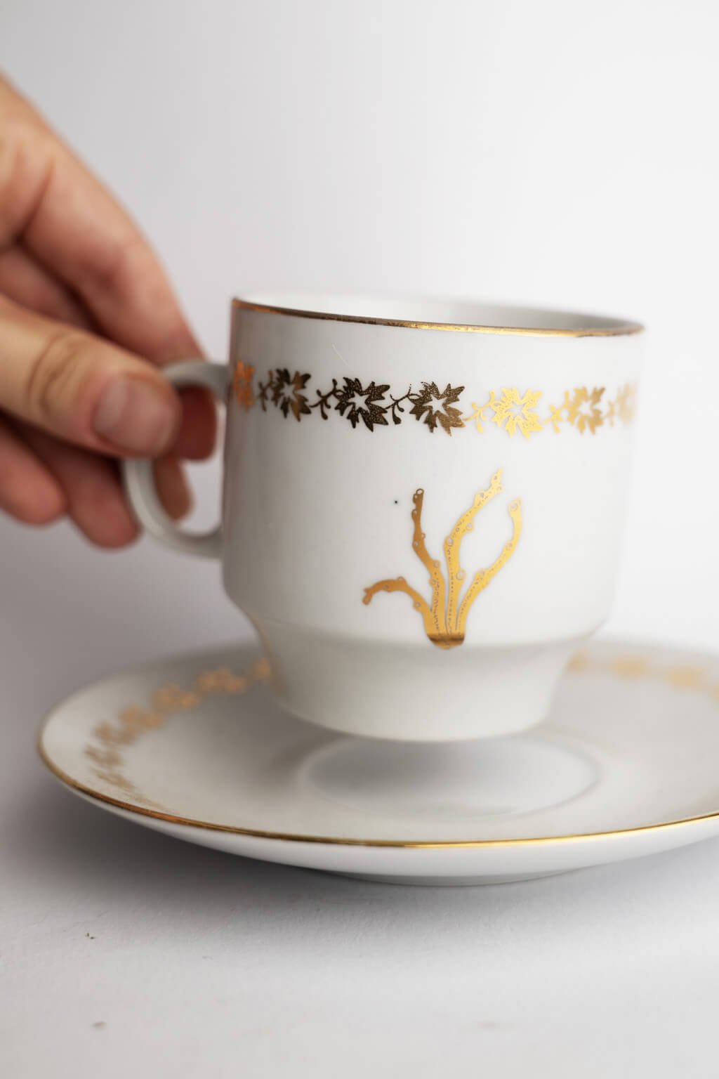 Táto vintage šálka ožila s novým kúzlom vďaka zlatej kresbe koralu. Autorské kresby dodávajú týmto jedinečným kúskom nový rozmer, čím sa premieňajú na nadčasové originály, ktoré sa vydávajú na svoju ďalšiu životnú cestu. Nechajte sa očariť jej jemnou eleganciou a milým detailom, ktorý vás prekvapí pri každom dúšku. Táto šálka sa stane nielen obľúbeným spoločníkom pri káve alebo čaji, ale aj štýlovým prvkom vašej kuchyne. Každý kus je navyše skutočným originálom, ktorý vnesie do vášho domova jedinečnosť a teplo.
