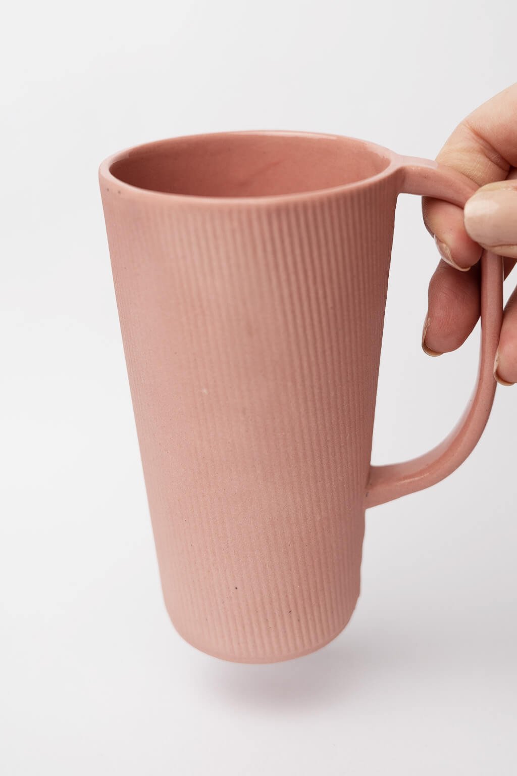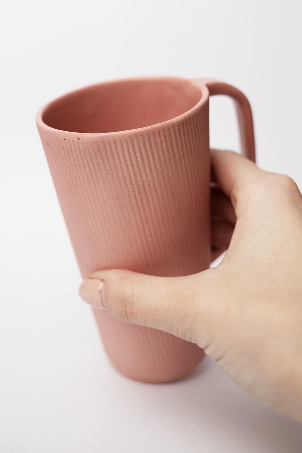 Keramický hrnček s nežnou matnou ružovou glazúrou a jedinečnou vrúbkovanou textúrou prináša do každého dňa dotyk originality a vkusu. Lesklé ucho hrnčeka pôsobí luxusne a dodáva mu šmrnc, vďaka čomu bude ozdobou akéhokoľvek stola. Hrnček je vyrobený z kvalitnej keramiky, čo zaručuje príjemný pocit pri držaní a dlhú životnosť.