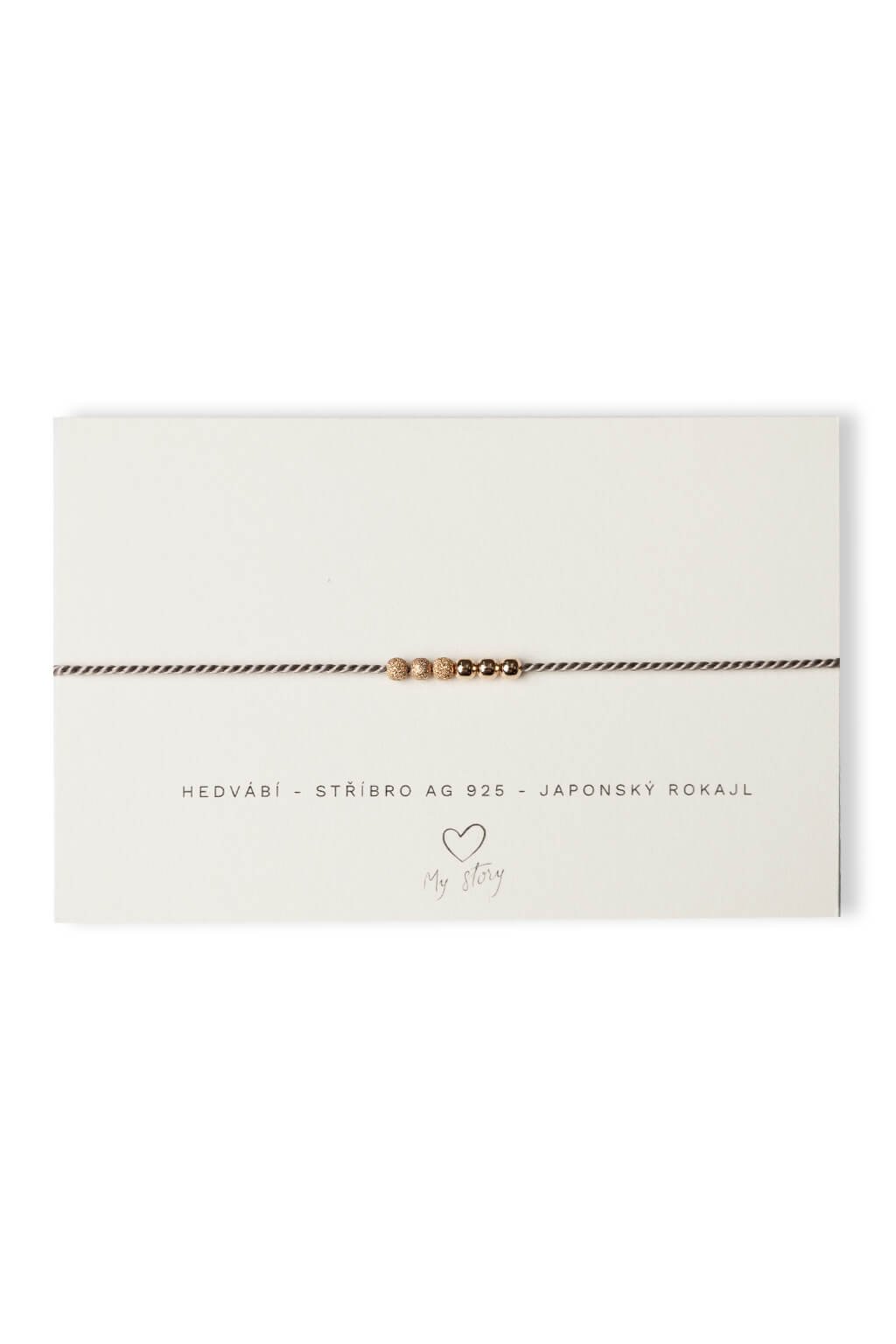 Luxusný elegantný a pritom minimalistický náramok zdobený ružovo pozlátenými striebornými korálkami Ag925 a tromi žiarivými „star dust“ korálkami, pokrytými 18-karátovým zlatom. Náramok je navlečený na jemnej šedej hodvábnej šnúrke.
