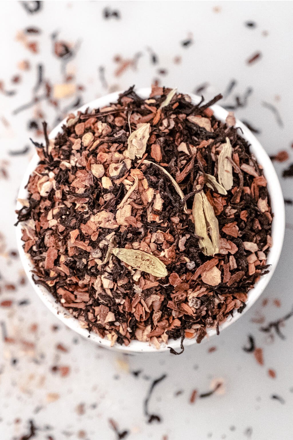 - Assam (čierny čaj), zázvor, kardamóm, škorica, badián, klinček, korenie