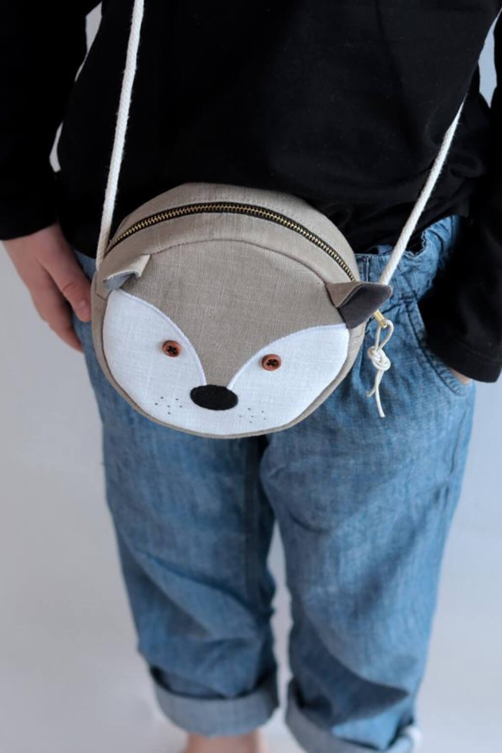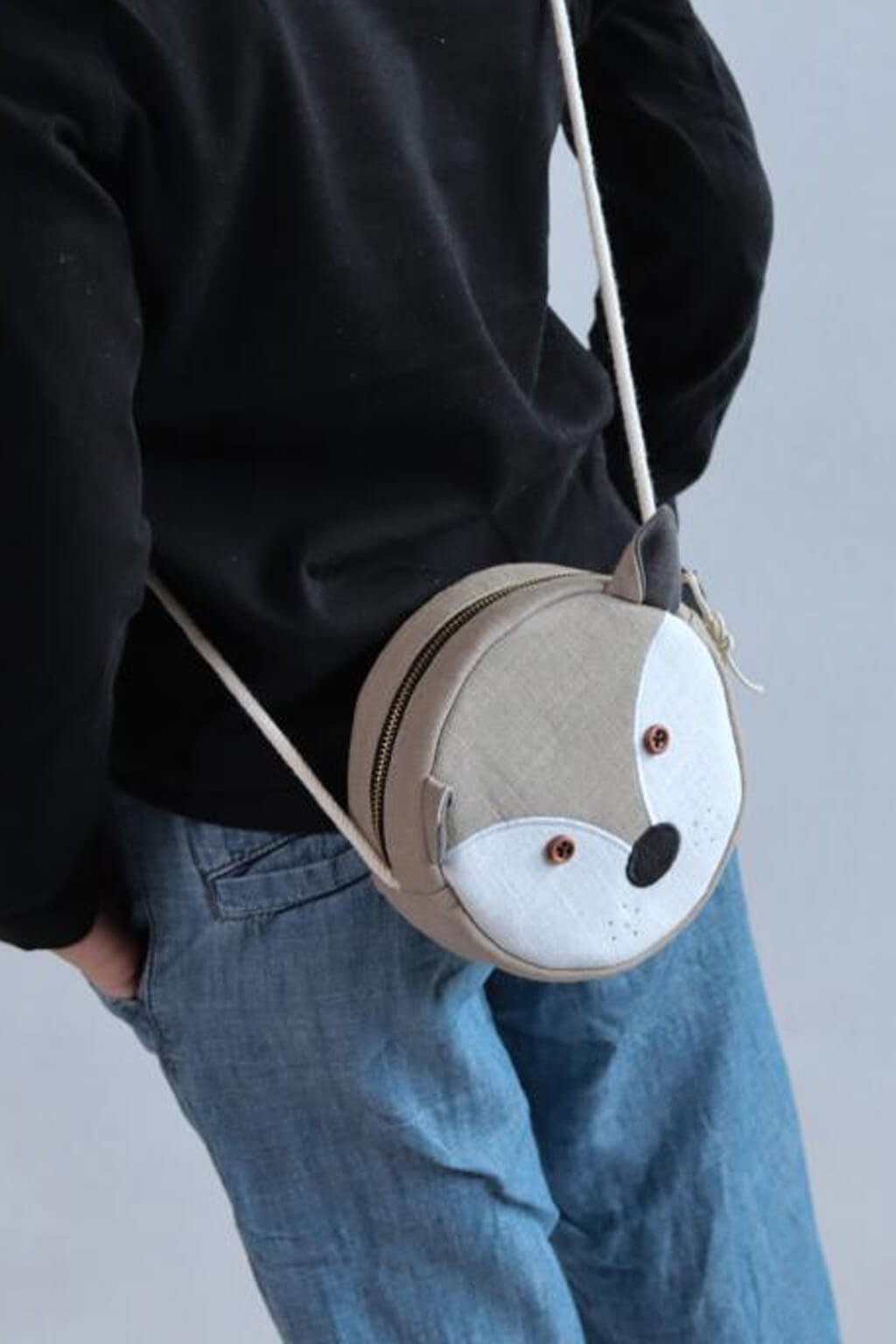 Ručne šitá okrúhla crossbody kabelka s motívom zvieratiek pre všetky hravé deti.
