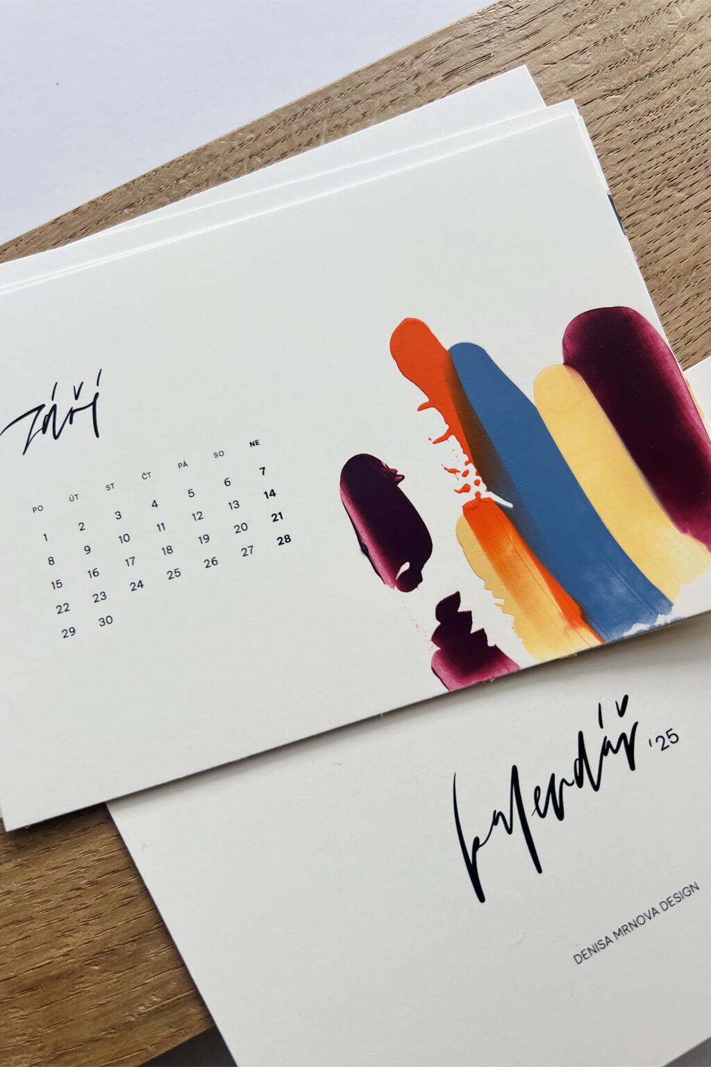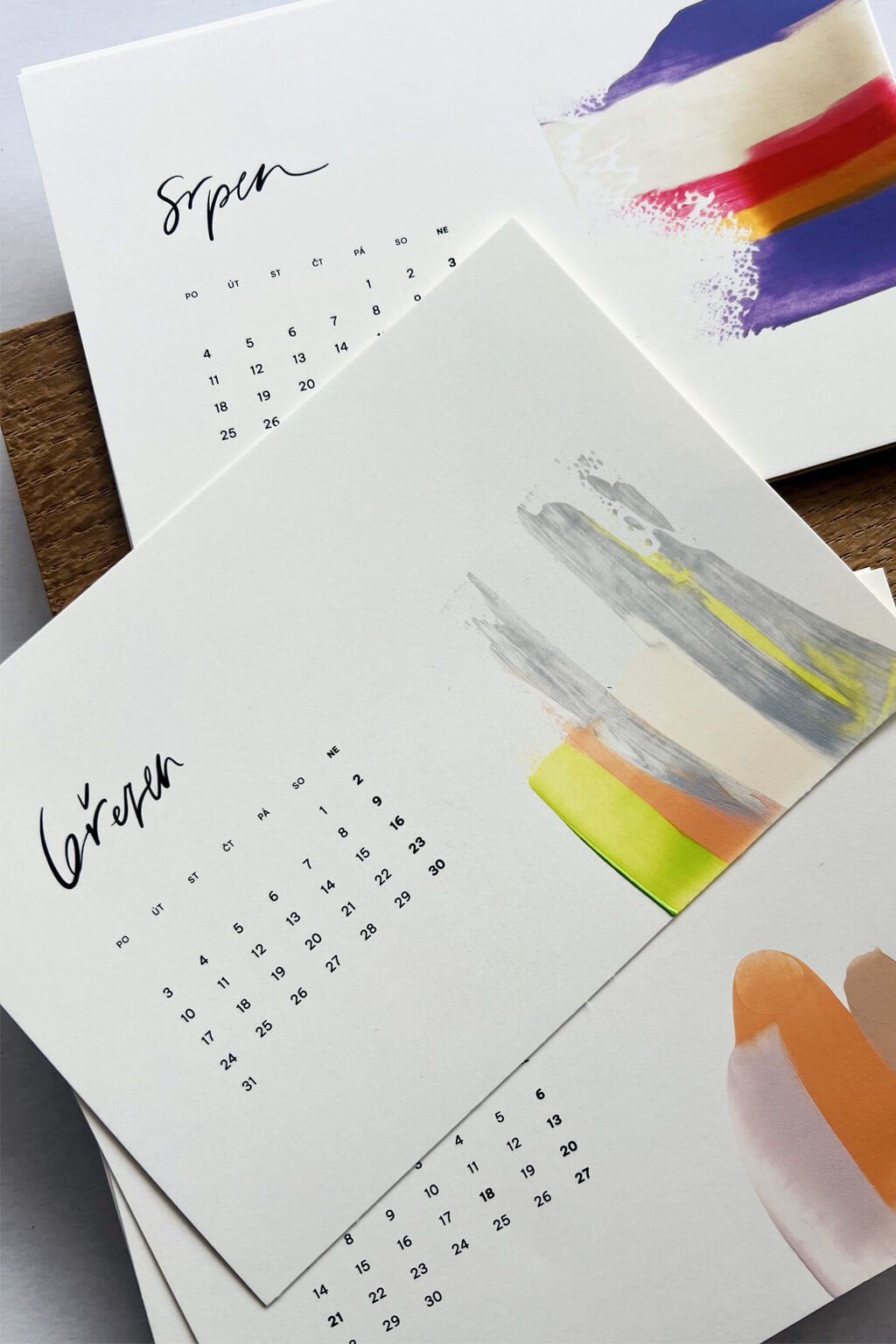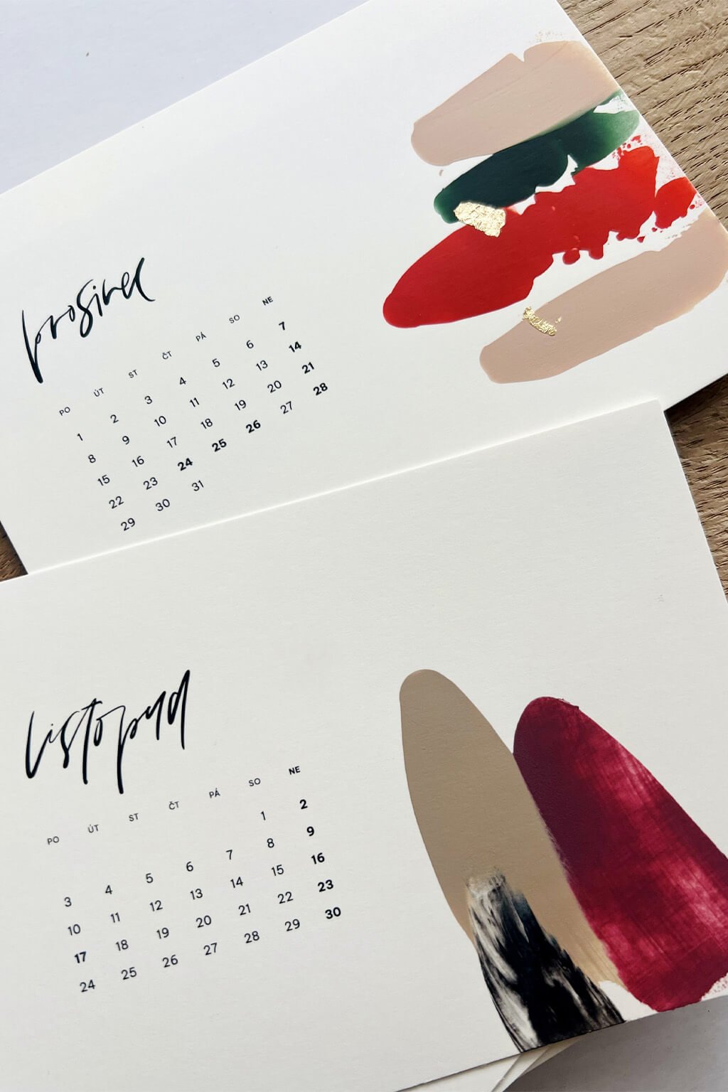 Karty jednotlivých mesiacov sú ručne dokončené abstraktnou maľbou akrylovými farbami, každý mesiac v iných odtieňoch, ktoré zodpovedajú nálade daného mesiaca ☺ december je potom aj pozlátený.
