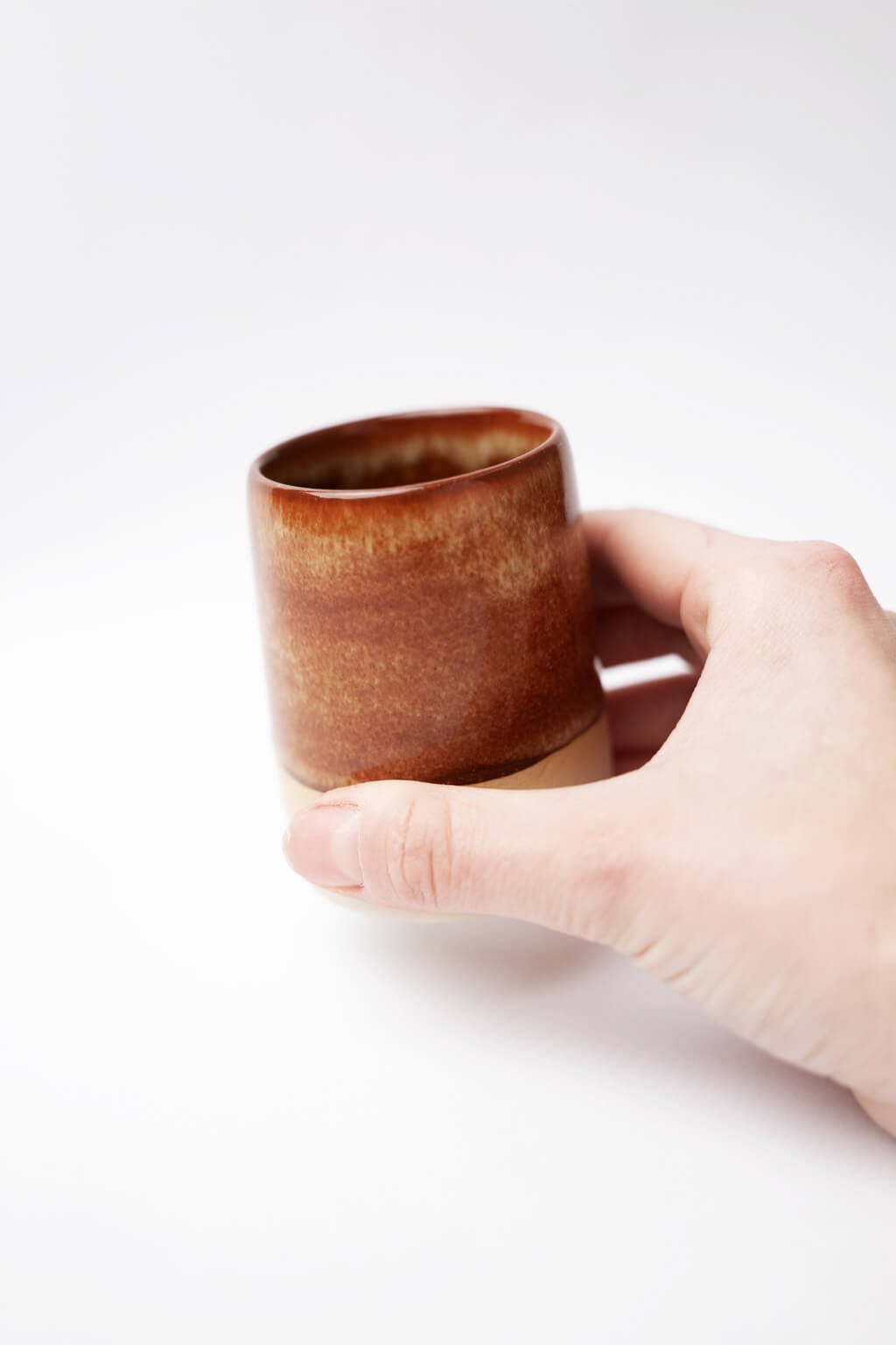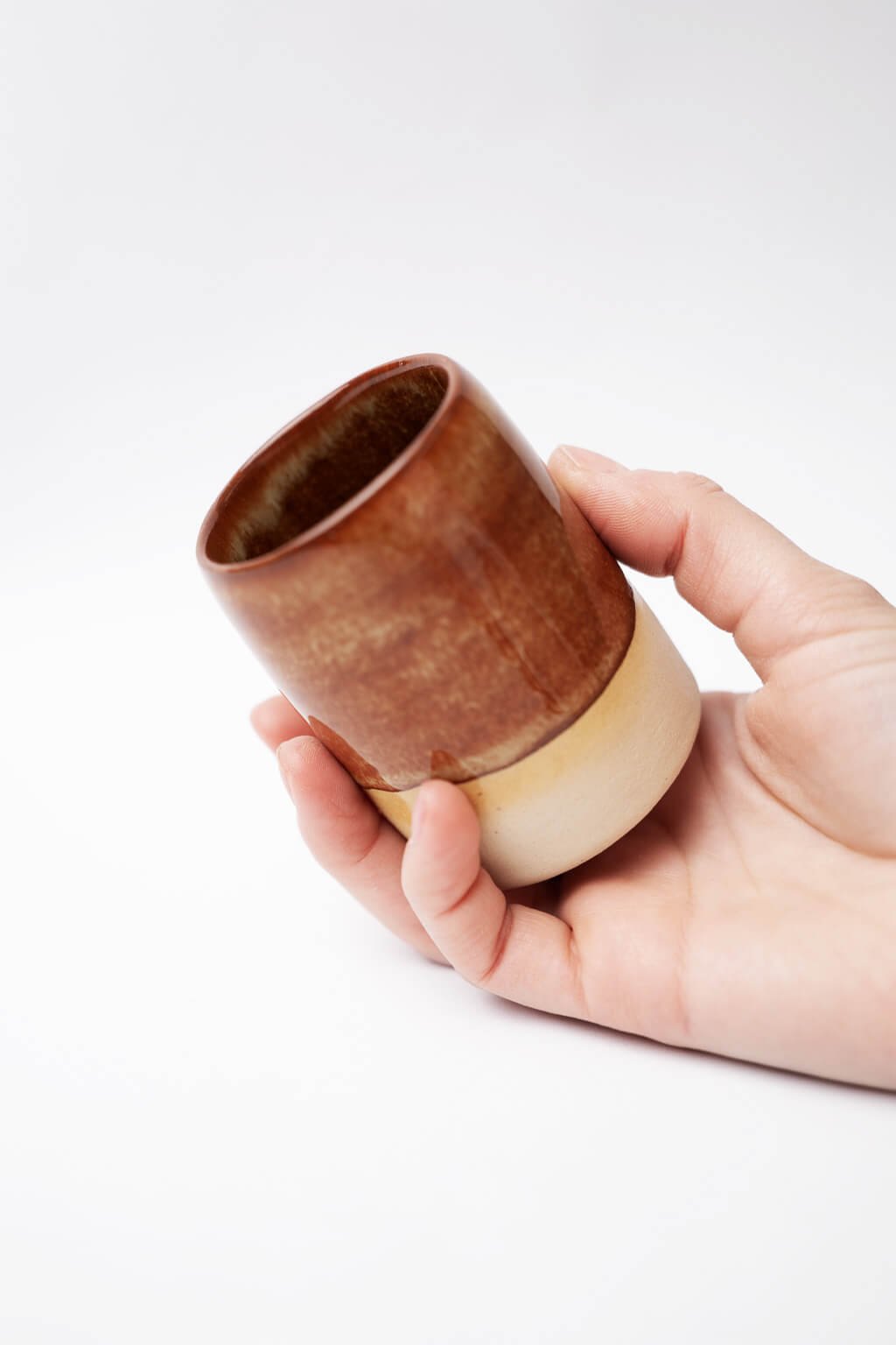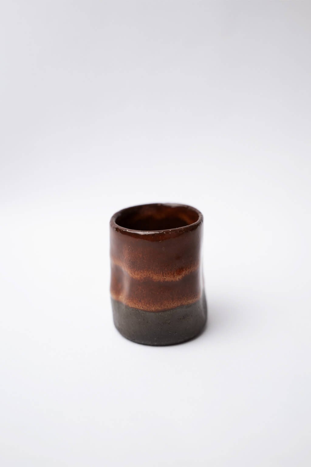 Tento ručne tvarovaný kalíšok je ideálny na kávu alebo horúcu čokoládu a vyniká svojou jedinečnosťou. Lesklá medovo hnedá glazúra kontrastuje so svetlým alebo tmavým hlineným základom, čo podčiarkuje jeho elegantný vzhľad. Kompaktný tvar zaisťuje pohodlné držanie a robí ho skvelým praktickým aj štýlovým doplnkom.