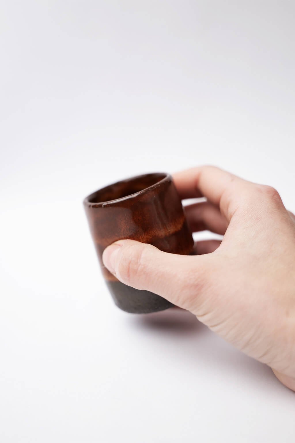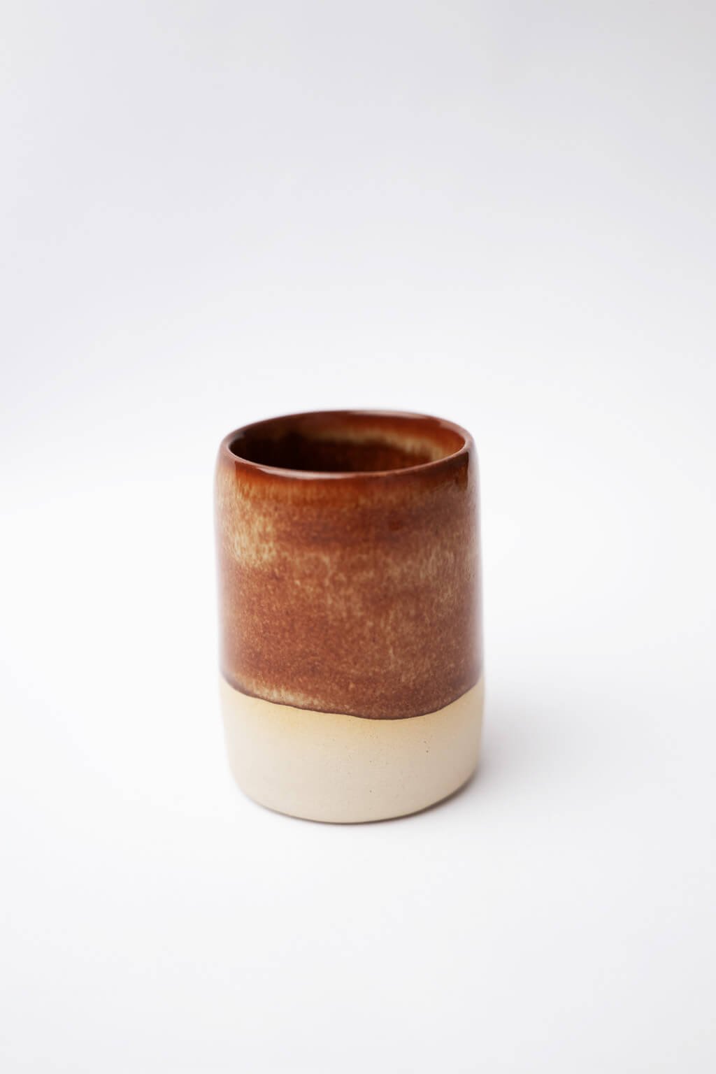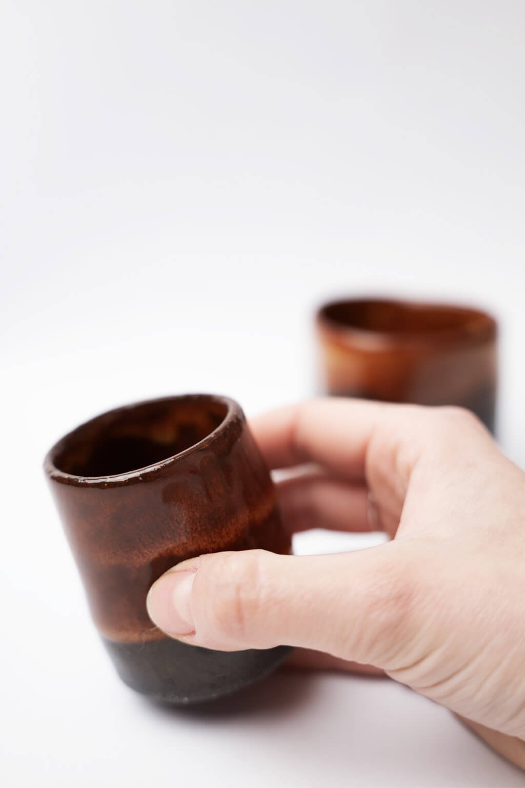 Tento ručne tvarovaný kalíšok je ideálny na kávu alebo horúcu čokoládu a vyniká svojou jedinečnosťou. Lesklá medovo hnedá glazúra kontrastuje so svetlým alebo tmavým hlineným základom, čo podčiarkuje jeho elegantný vzhľad. Kompaktný tvar zaisťuje pohodlné držanie a robí ho skvelým praktickým aj štýlovým doplnkom.