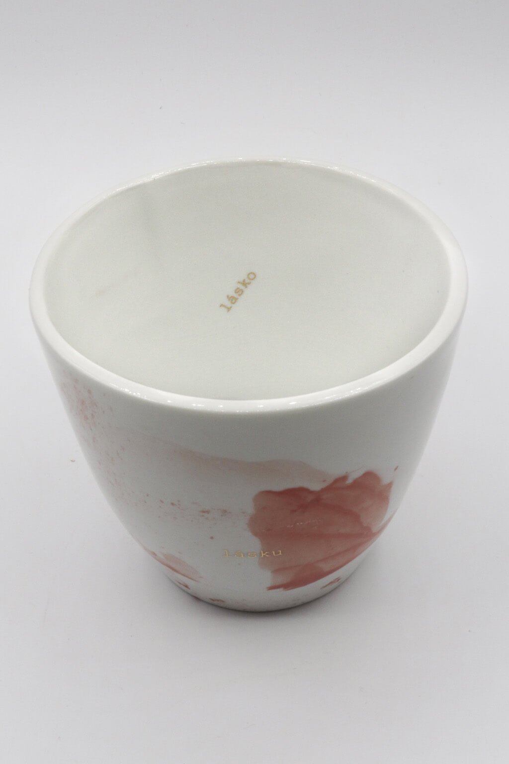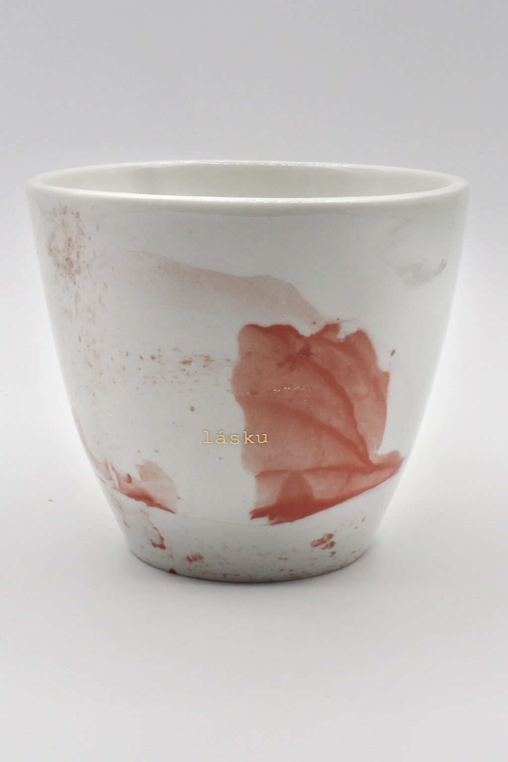Jemne štruktúrovaný kalíšok je zdobený červeným pigmentom a zlatým nápisom "lásku, lásko". Prefarbenie červeného pigmentu vytvára neopakovateľnú kresbu, čo činí každý kalíšok jedinečným originálom.
