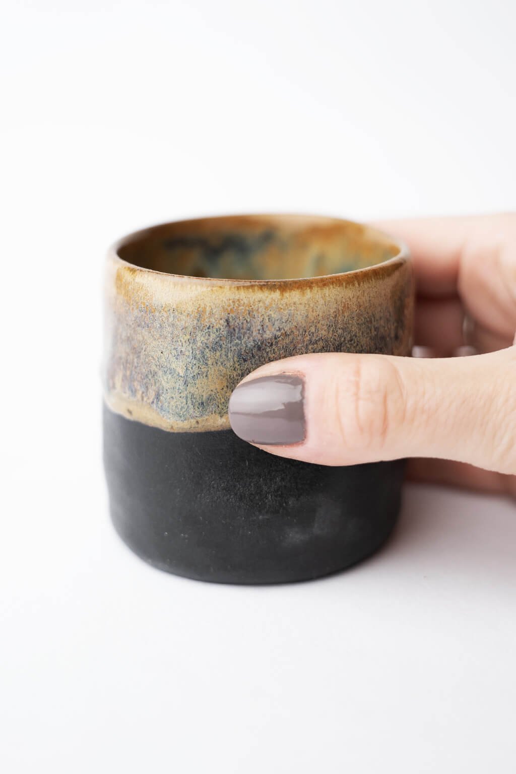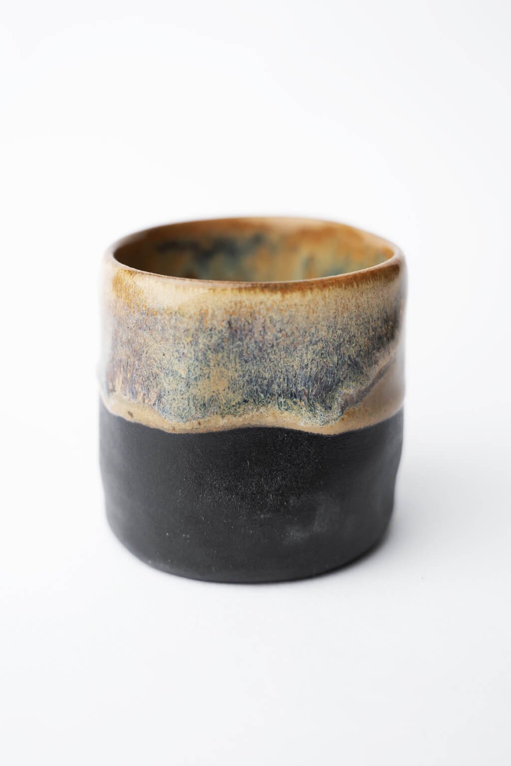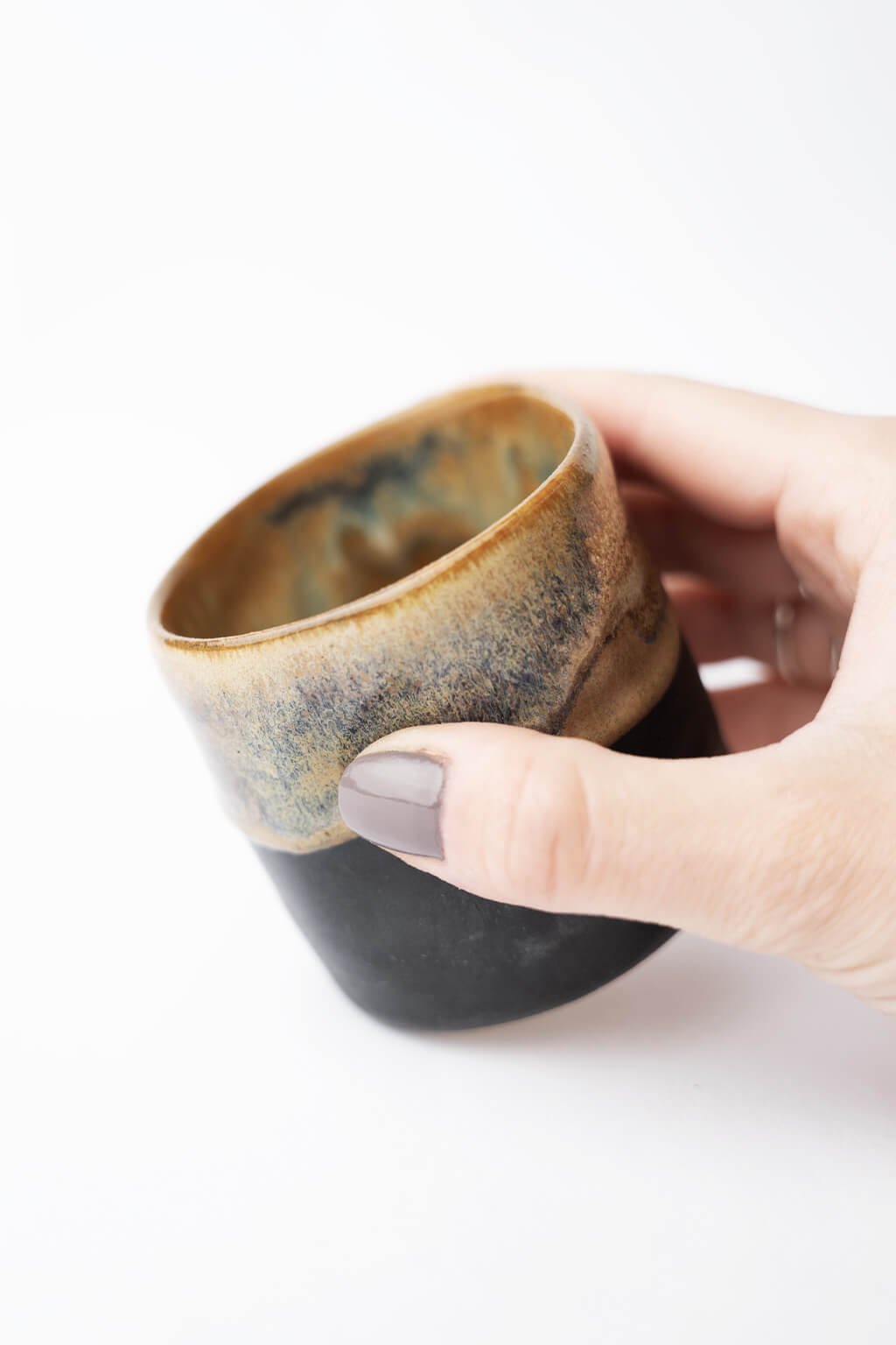 Tento malý keramický kalíšok je ideálny na vychutnanie kávy alebo čaju a prinesie jedinečný zážitok z každého dúška. Vďaka preliačenému dizajnu skvele padne do ruky a ponúka pohodlné uchopenie. Jeho povrch zdobí jemne stekajúca medovo hnedastá hnedá glazúra cez svetlý základ, ktorá vytvára originálny a prirodzený vzhľad.