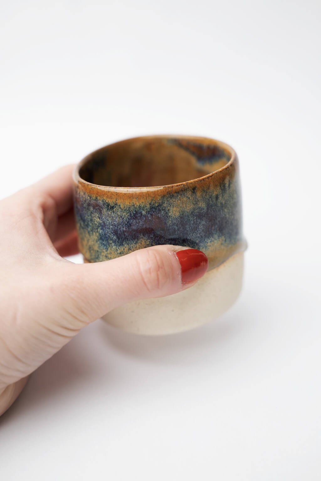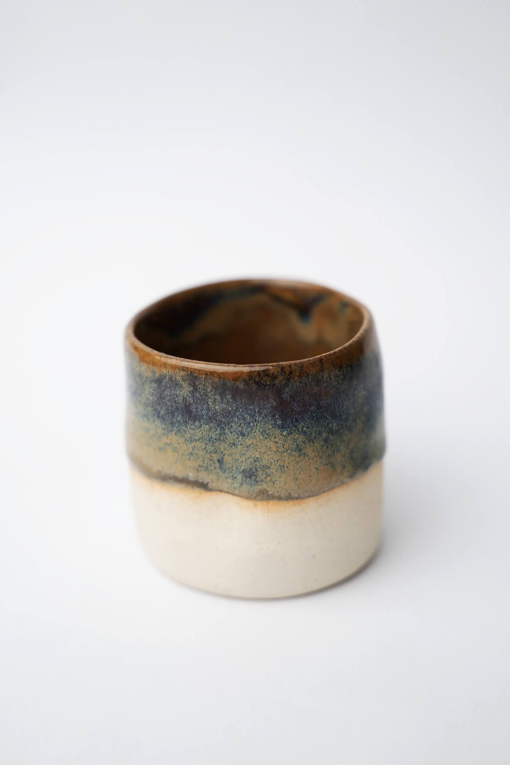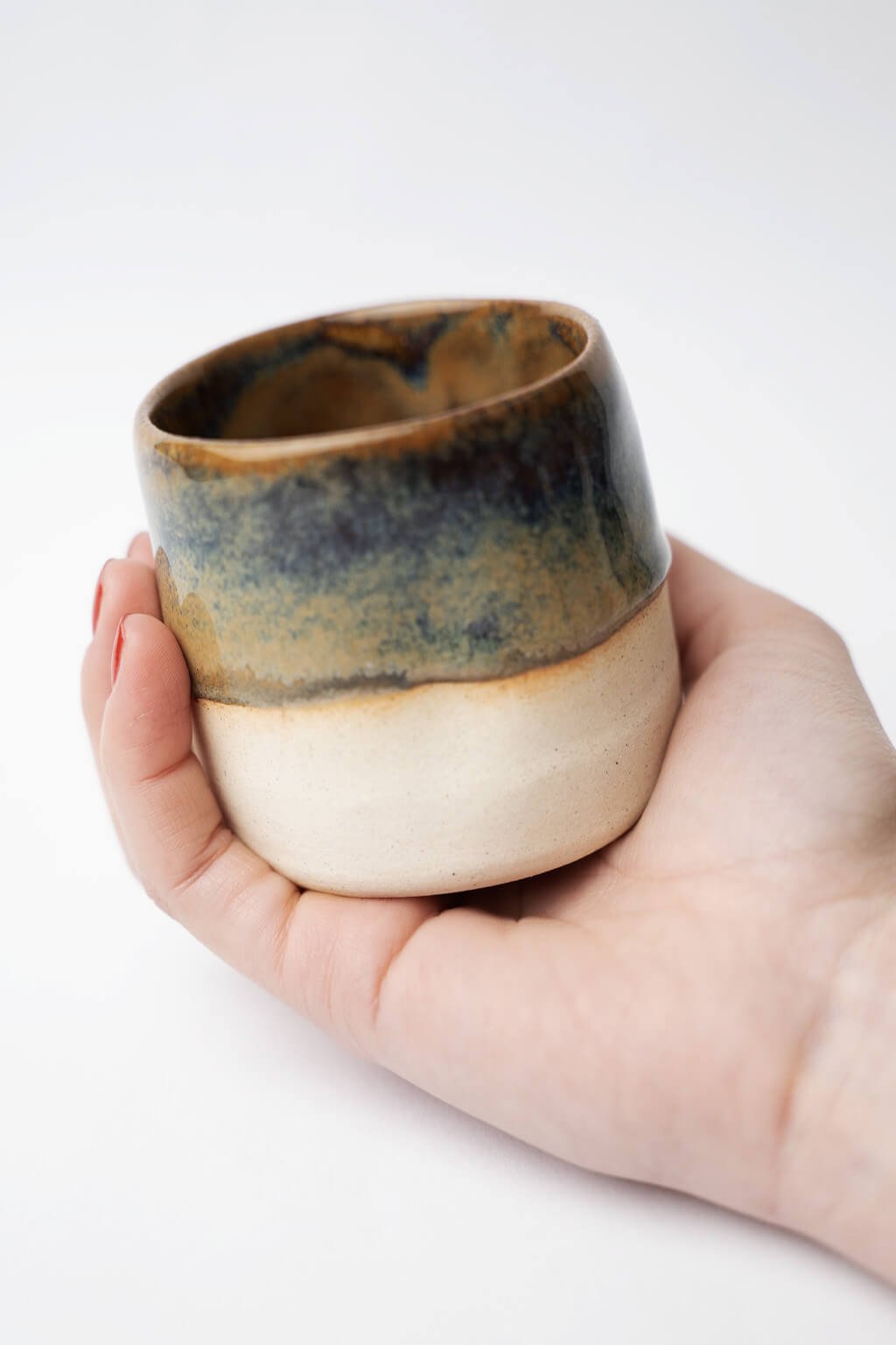Tento malý keramický kalíšok je ideálny na vychutnanie kávy alebo čaju a prinesie jedinečný zážitok z každého dúška. Vďaka preliačenému dizajnu skvele padne do ruky a ponúka pohodlné uchopenie. Jeho povrch zdobí jemne stekajúca okrovo modrastá glazúra, ktorá vytvára originálny a prirodzený vzhľad.