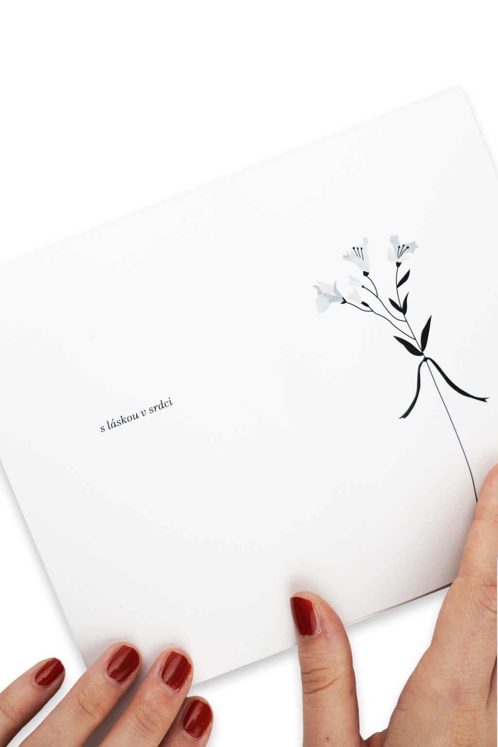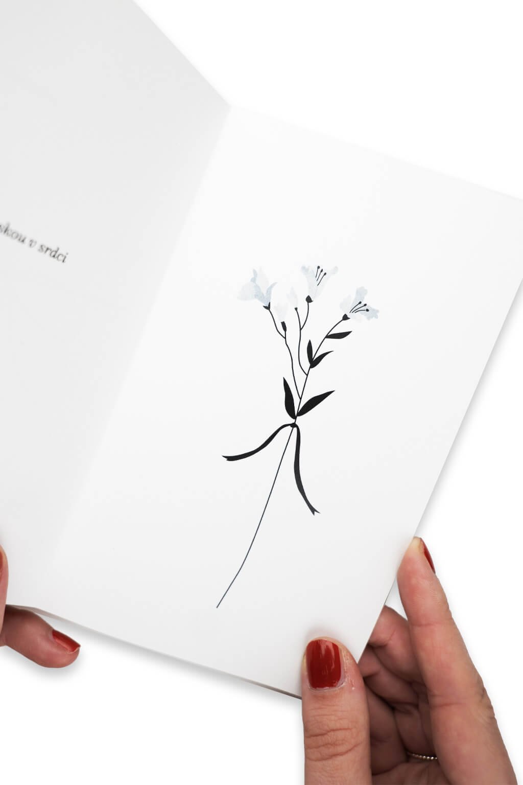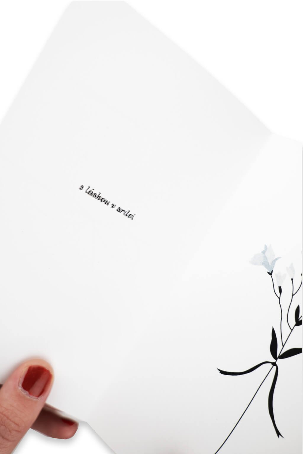Vo vnútri kondolencie je predtlačený text "S láskou v srdci" a autorská ilustrácia modrej kvetiny.