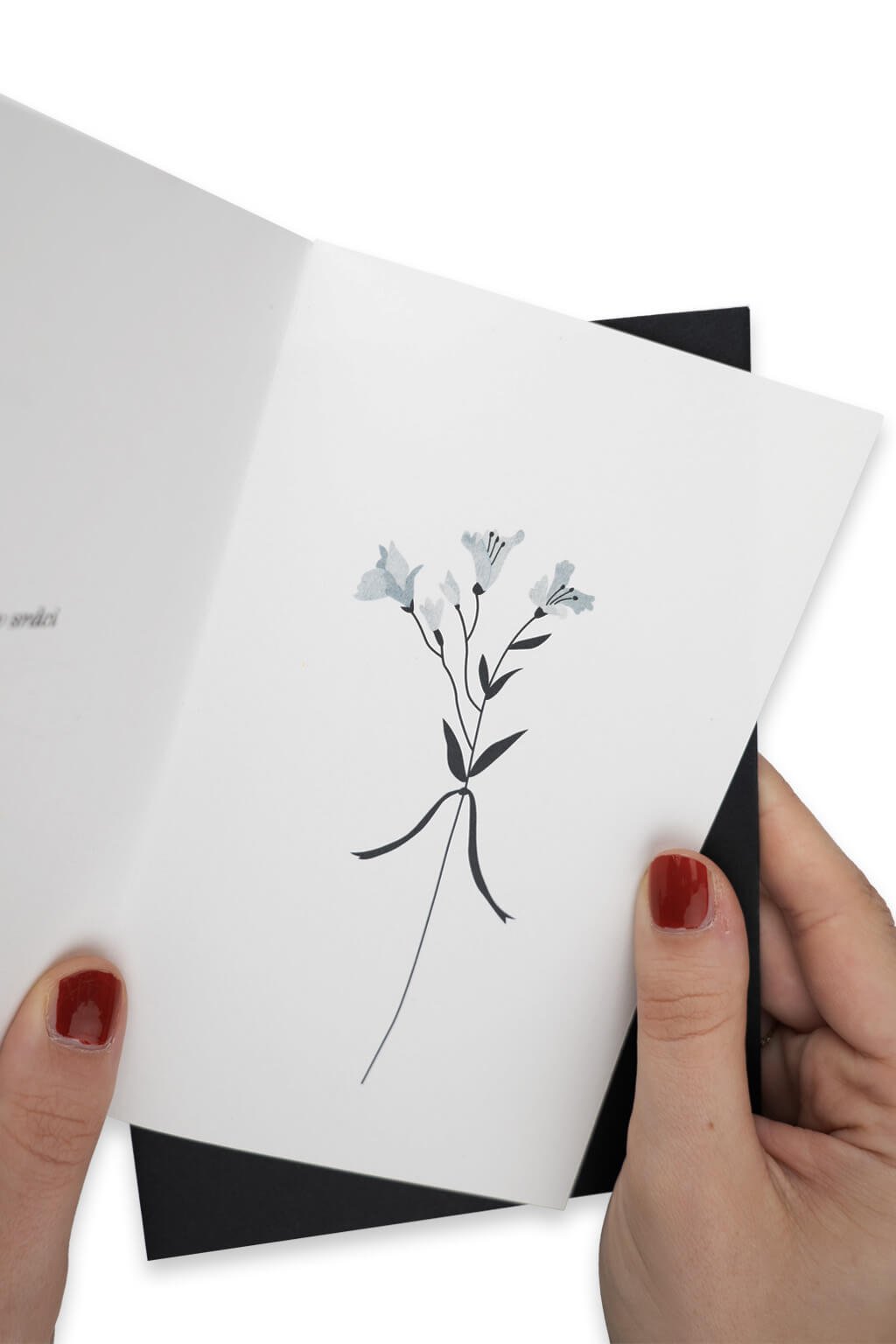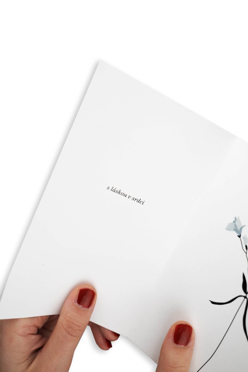 Vo vnútri kondolencie je predtlačený text "s láskou v srdci" a autorská ilustrácia modrej kvetiny.