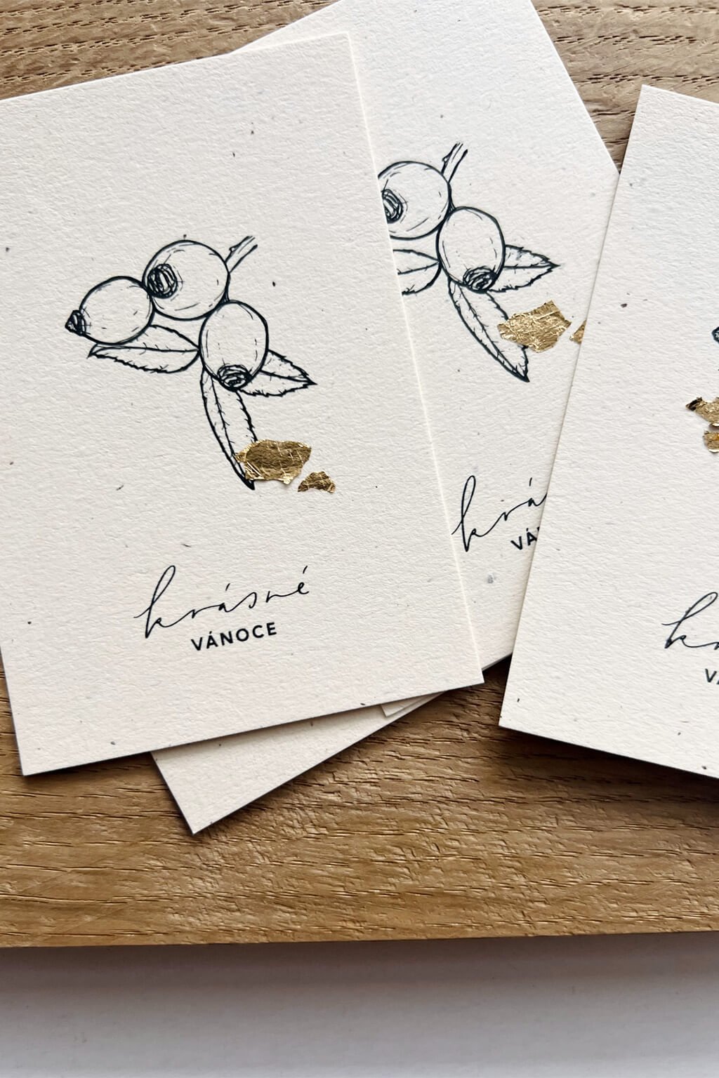 Elegantná kartička o rozmeroch 70 × 100 mm je ideálnym doplnkom, ktorý dodá vášmu darčeku osobitosť a čaro. Vďaka svojmu precíznemu spracovaniu sa stane nielen praktickým, ale aj estetickým detailom, ktorý poteší každého obdarovaného. Kartička je vyrobená z vysoko kvalitného grafického papiera s jemnou prírodnou textúrou, ktorá podčiarkuje jej výnimočnosť. Dizajn zdobí autorská kresba, starostlivo vytlačená s dôrazom na každý detail. Aby bolo dosiahnuté ešte luxusnejšieho dojmu, je tlač doplnená o prvky zlátenia, ktoré celé dielo povyšujú na úroveň malého umeleckého kúsku.