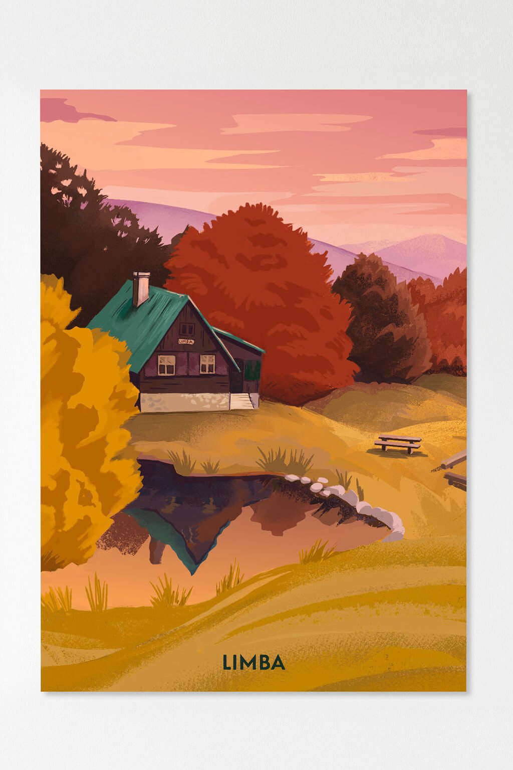 Vo Veľkej Fatre zostaneme aj týmto plagátom z kolekcie kultových útulní. Na juhovýchodnom svahu Rakytova sa nachádza priamo rozprávková útulňa Limba. Tá ešte donedávna slúžila ako poľovnícka chata.