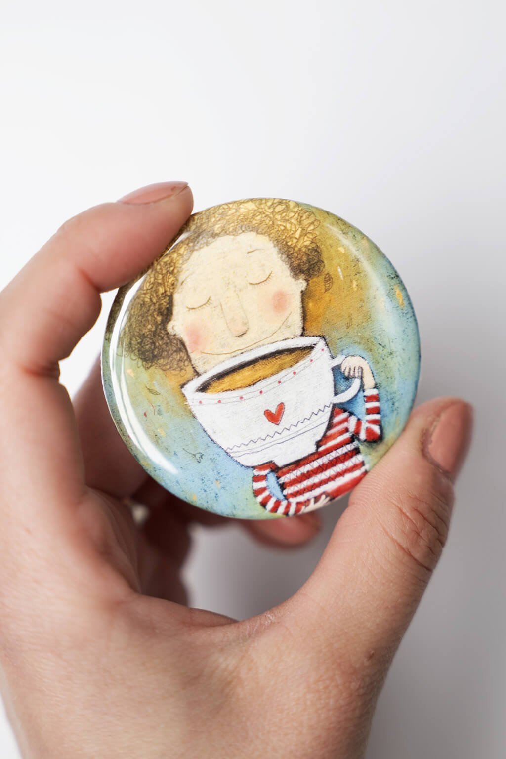 Táto magnetická placka s motívom milovníčky čaju poteší všetkých, ktorí si radi vychutnajú svoj obľúbený šálok. S priemerom 5,6 cm sa skvele hodí na chladničku, tabuľu alebo iný kovový povrch, kde bude pripomínať chvíle pokoja a pohody. Vďaka silnému magnetu drží pevne na mieste a zvládne udržať aj ľahké poznámky alebo recepty.