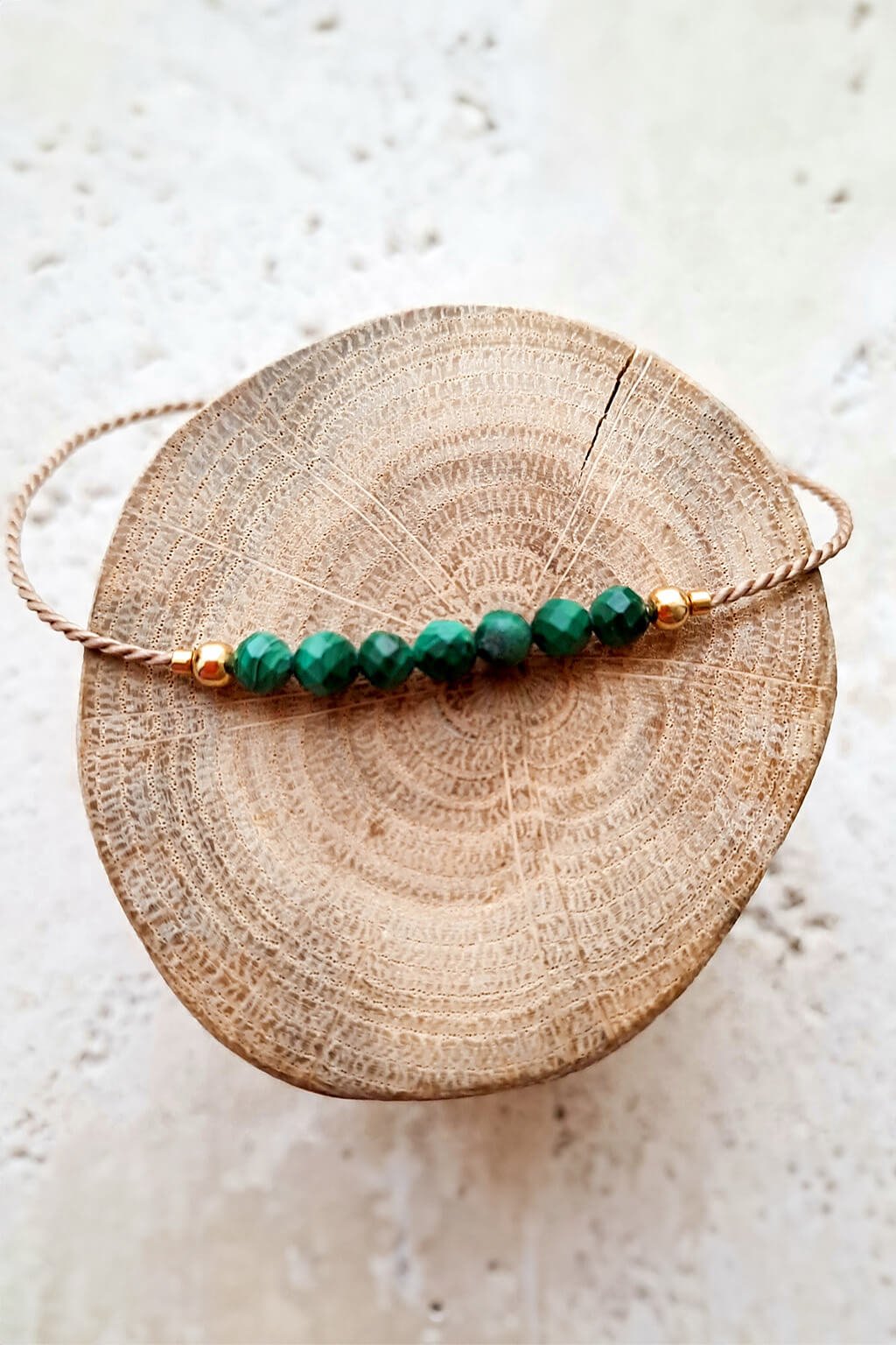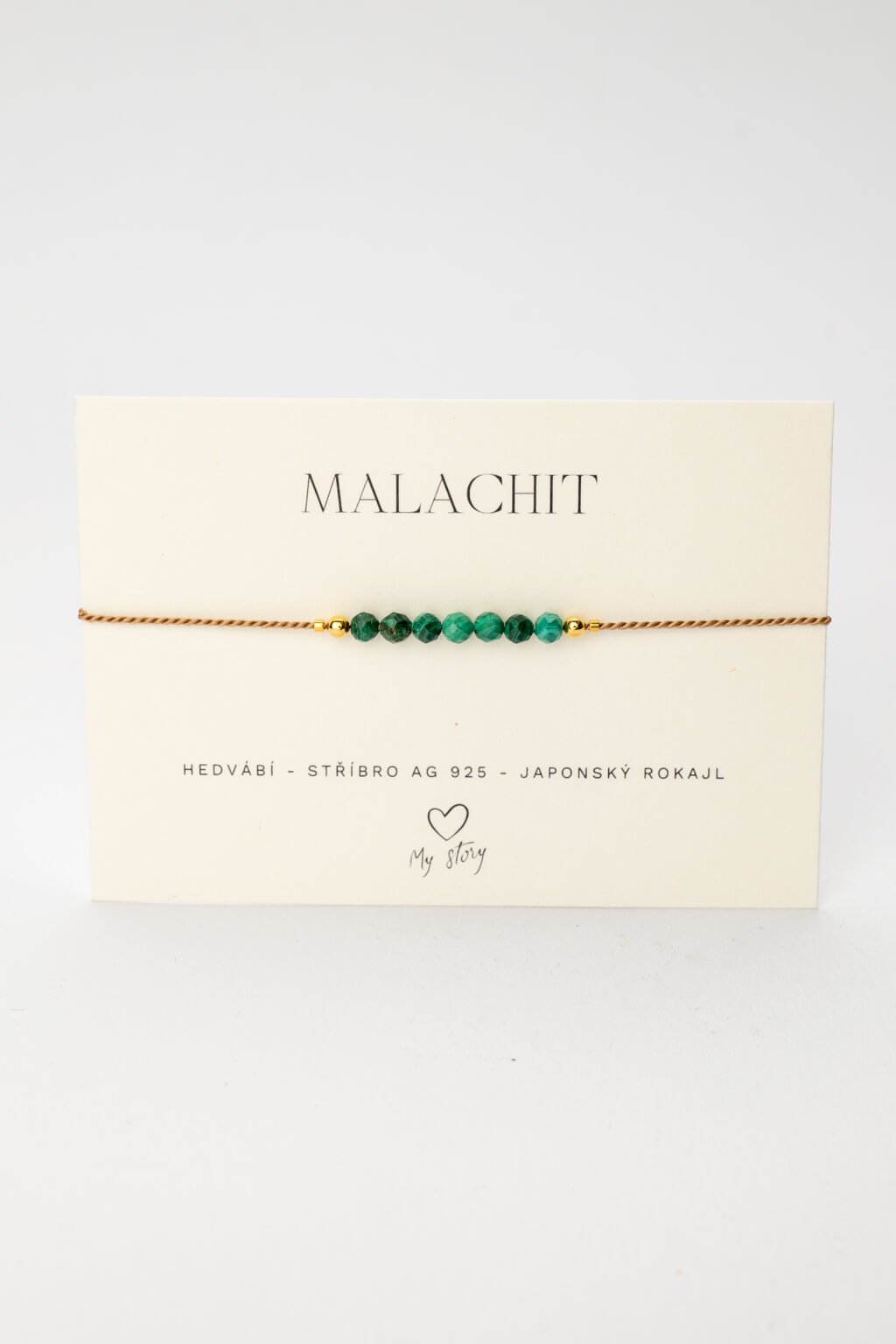 Náramok Malachit je šperk, ktorý kombinuje krásu s hlbokým významom. Na béžovej hodvábnej šnúrke sú navlečené fazetované korálky malachitu, doplnené pozlátenými korálkami zo striebra Ag925. Malachit je známy ako silný ochranný kameň, ktorý absorbuje negatívne energie, upokojuje nervovú sústavu a podporuje pokojný spánok.