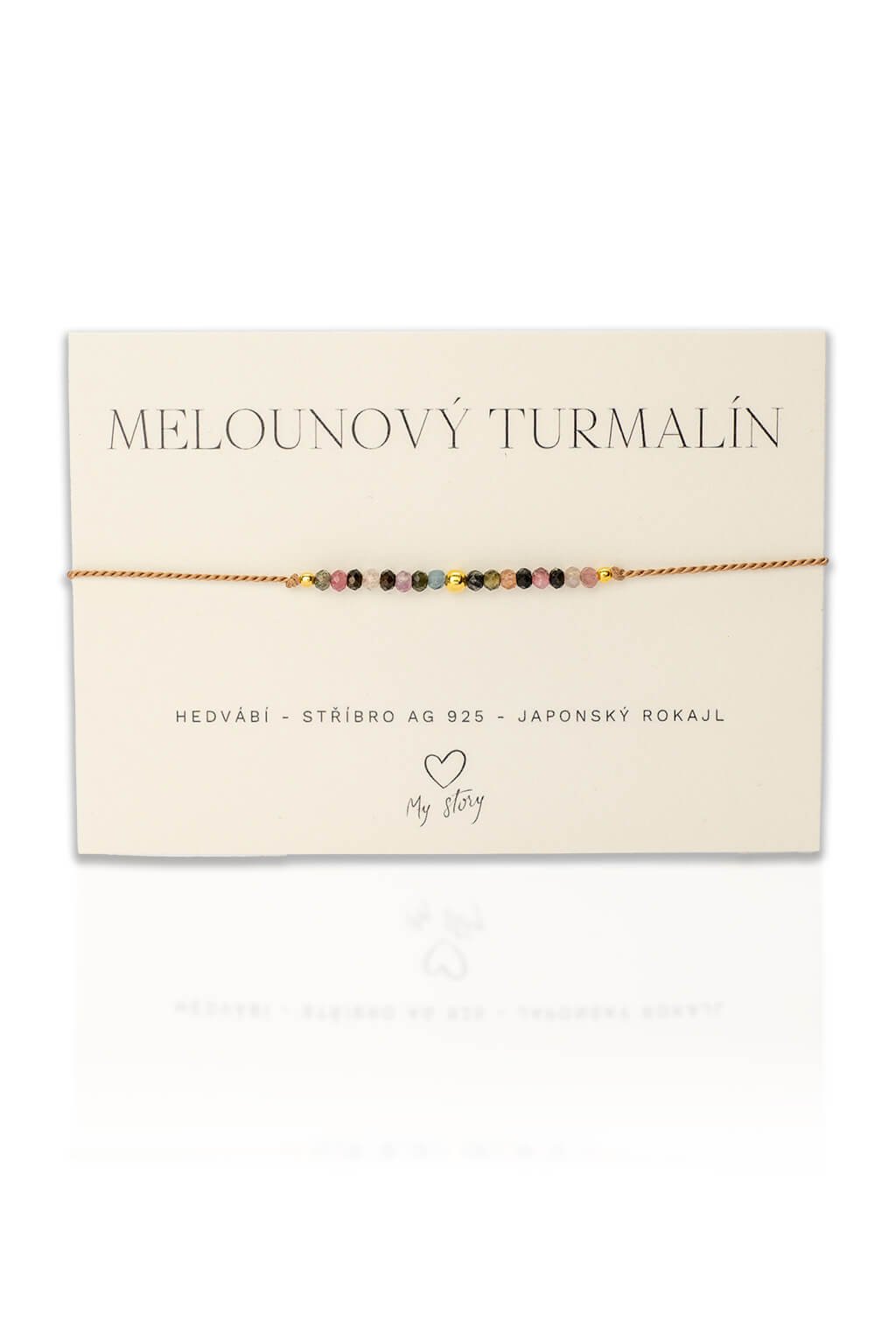 - Materiál: Melónový Turmalín, pozlátené korálky Ag925, hodvábna šnúrka