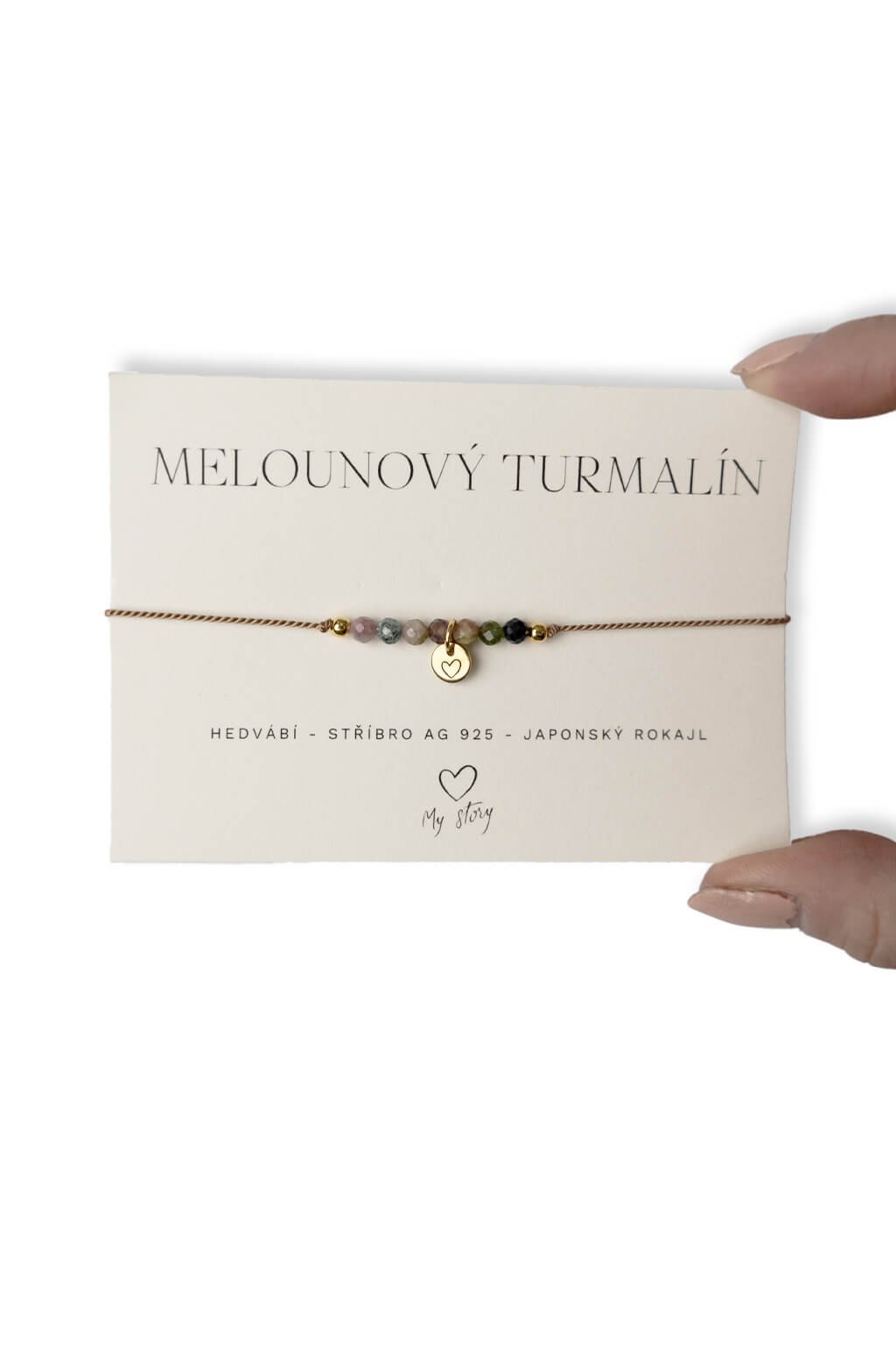 Náramok s Melónovým Turmalínom a plackou je elegantný a unikátny šperk, ktorý kombinuje krásu a harmóniu. Fazetované korálky Melónového Turmalínu sú doplnené pozlátenými korálkami zo striebra Ag925 a pozlátenou plackou z chirurgickej ocele, čo vytvára nádhernú kompozíciu na béžovej hodvábnej šnúrke.