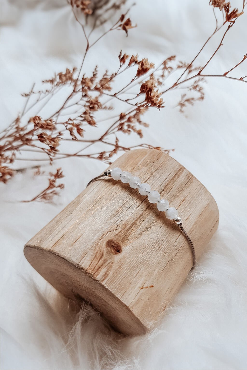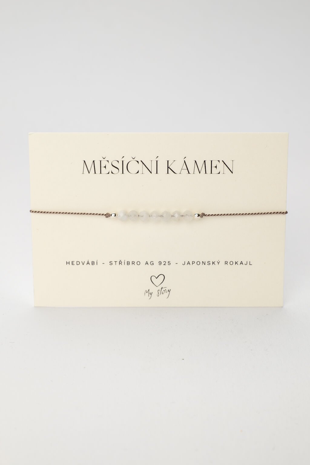 Náramok Mesačný kameň je šperk, ktorý stelesňuje ženskosť a jemnosť. Tento náramok sa skladá z fazetovaných korálikov mesačného kameňa na šedej hodvábnej šnúrke, zdobený striebornými korálikmi Ag925. Mesačný kameň, známy ako kameň ženy a matky, podporuje ženské vlastnosti, pomáha pri zdravotných problémoch špecifických pre ženy a otvára srdce pre nesebeckú lásku a intuíciu.