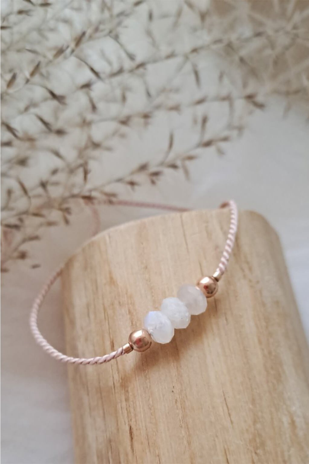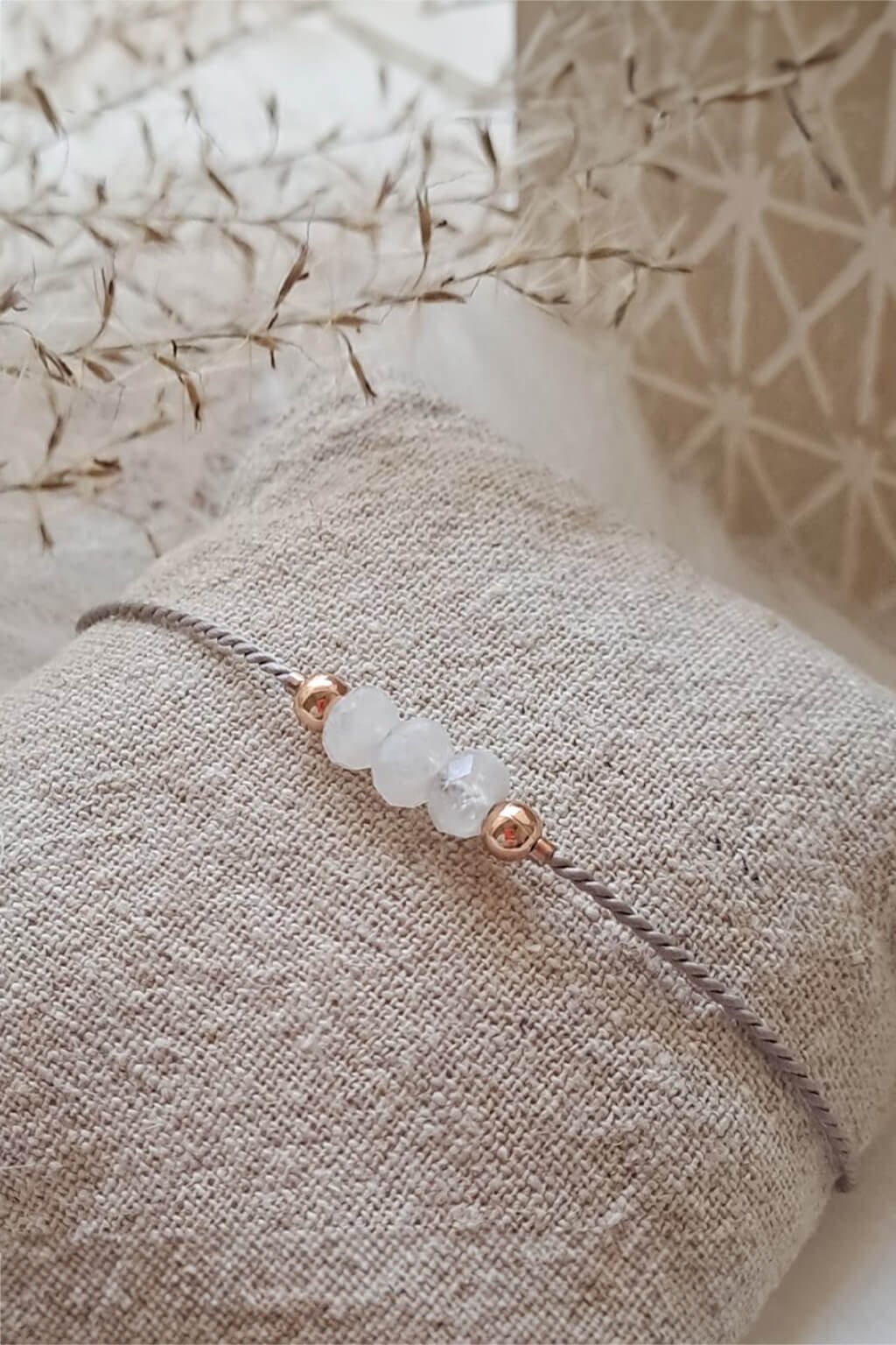 Tento náramok s mesačným kameňom v sebe kombinuje eleganciu a jemnú symboliku. Na šedej hodvábnej šnúrke sú umiestnené tri fazetované guličky mesačného kameňa, doplnené striebornými korálkami zo striebra Ag925.