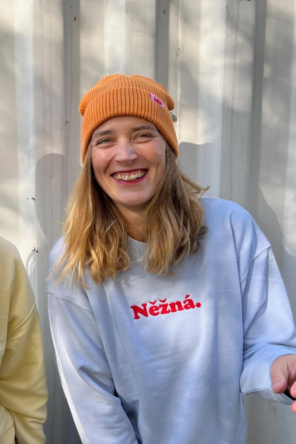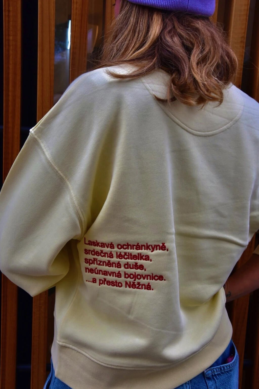 Na prednej strane nesie výšivku “Nežná”, na chrbte nájdeš nežné posolstvo nás žien – oboje ručne vyšívané s pohľadom a láskou.