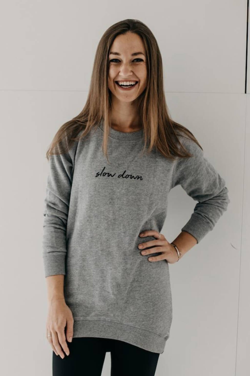 Dámska mikina/mikinošaty s predĺženým strihom, kde zadná časť je o kúsok dlhšia. Mikina je voľnejšieho strihu. Ak bežne nosíte M, do mikiny slow down S sa krásne schováte.