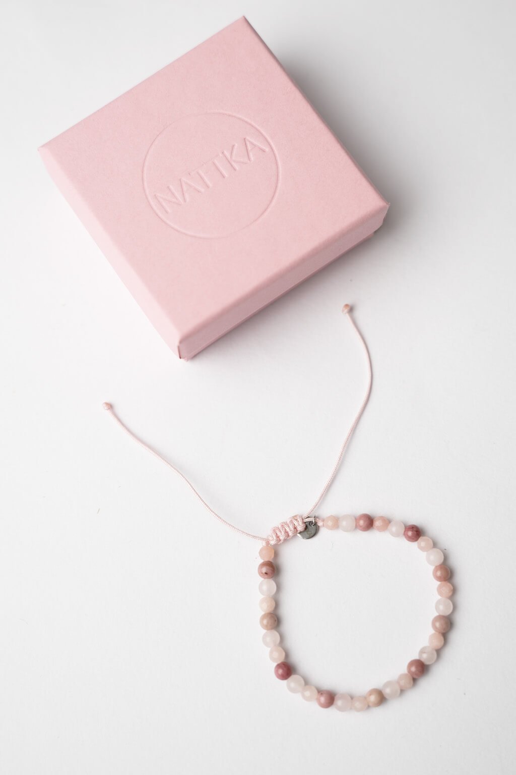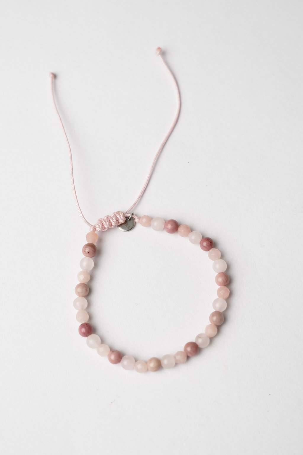 Minerálny náramok v nežných ružových tónoch zložený z jadeitu, ruženínu a rodochrozitu.