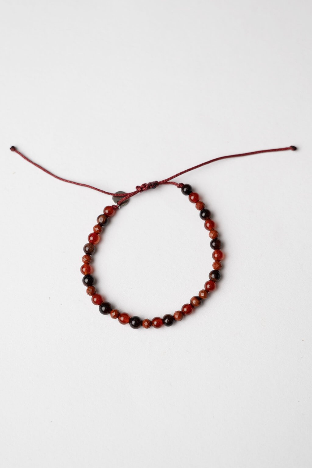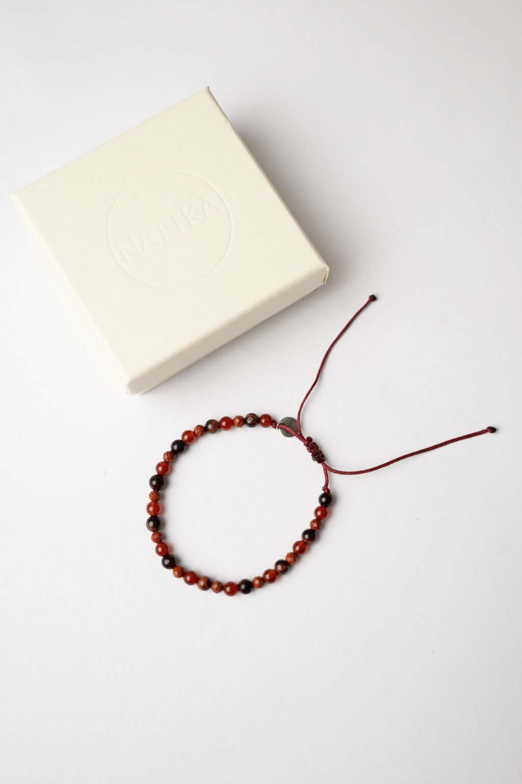 Minerálny náramok vo výrazných červených tónoch zložený z karneolu, býčieho oka a jaspisu.