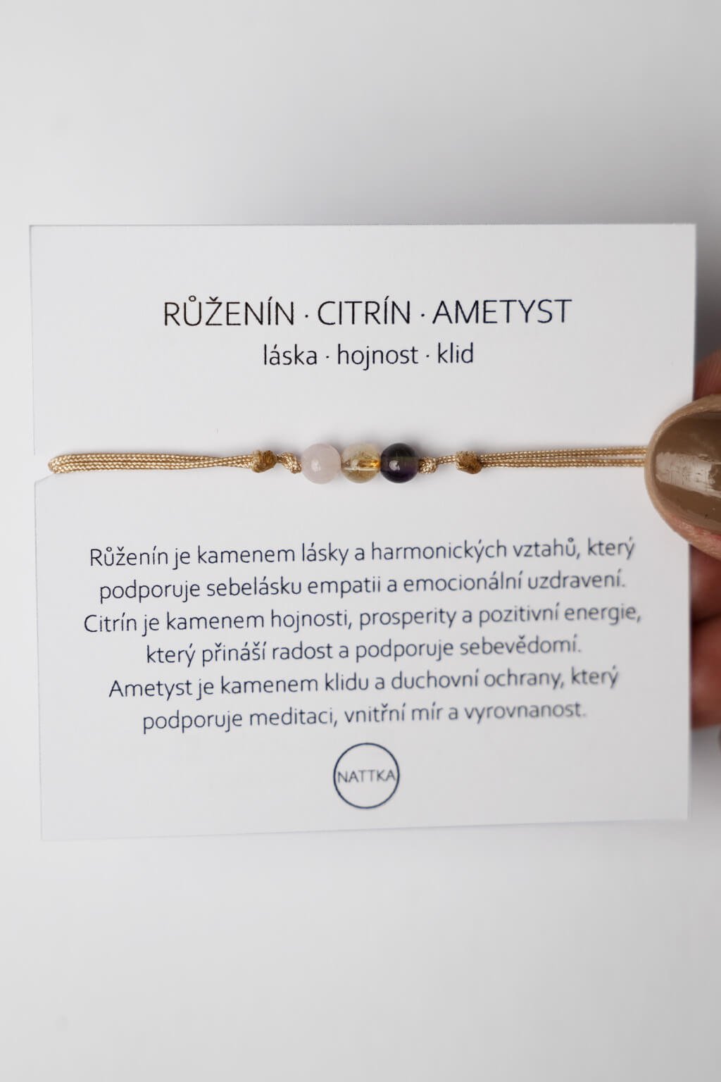Ruženín podporuje lásku a harmóniu, citrín prináša energiu a pozitívne myslenie, a ametyst zaisťuje pokoj a vyrovnanosť. Náramok je navlečený na pevnej šnúrke, ktorá sa ľahko prispôsobí veľkosti zápästia. Je skvelým doplnkom pre každodenné nosenie, či už pre osobnú energetickú podporu, alebo ako jemný štýlový šperk. Kombinácia týchto kameňov dáva náramku nielen estetický, ale aj pozitívny vplyv na vaše okolie.