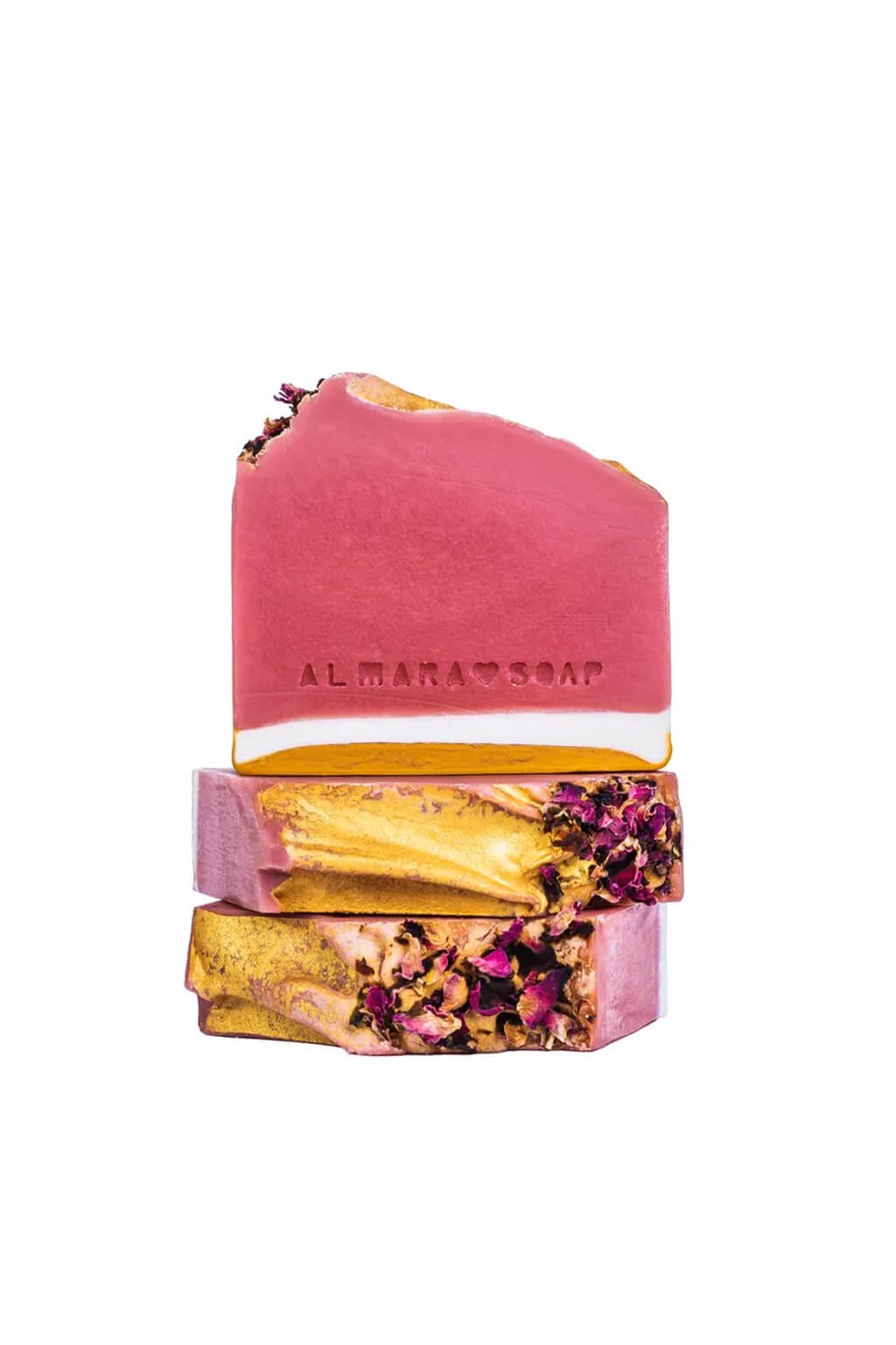 Aqua, Sodium Sunflowerate, Sodium Cocoate, Sodium Palmate, Sodium Olivate, Glycerin, Mica, Zinc Oxide, Parfum, Benzyl Benzoate, Rosa damascena Flower, Linalool, Limonene, Hexyl Cinnamal, CI 77491