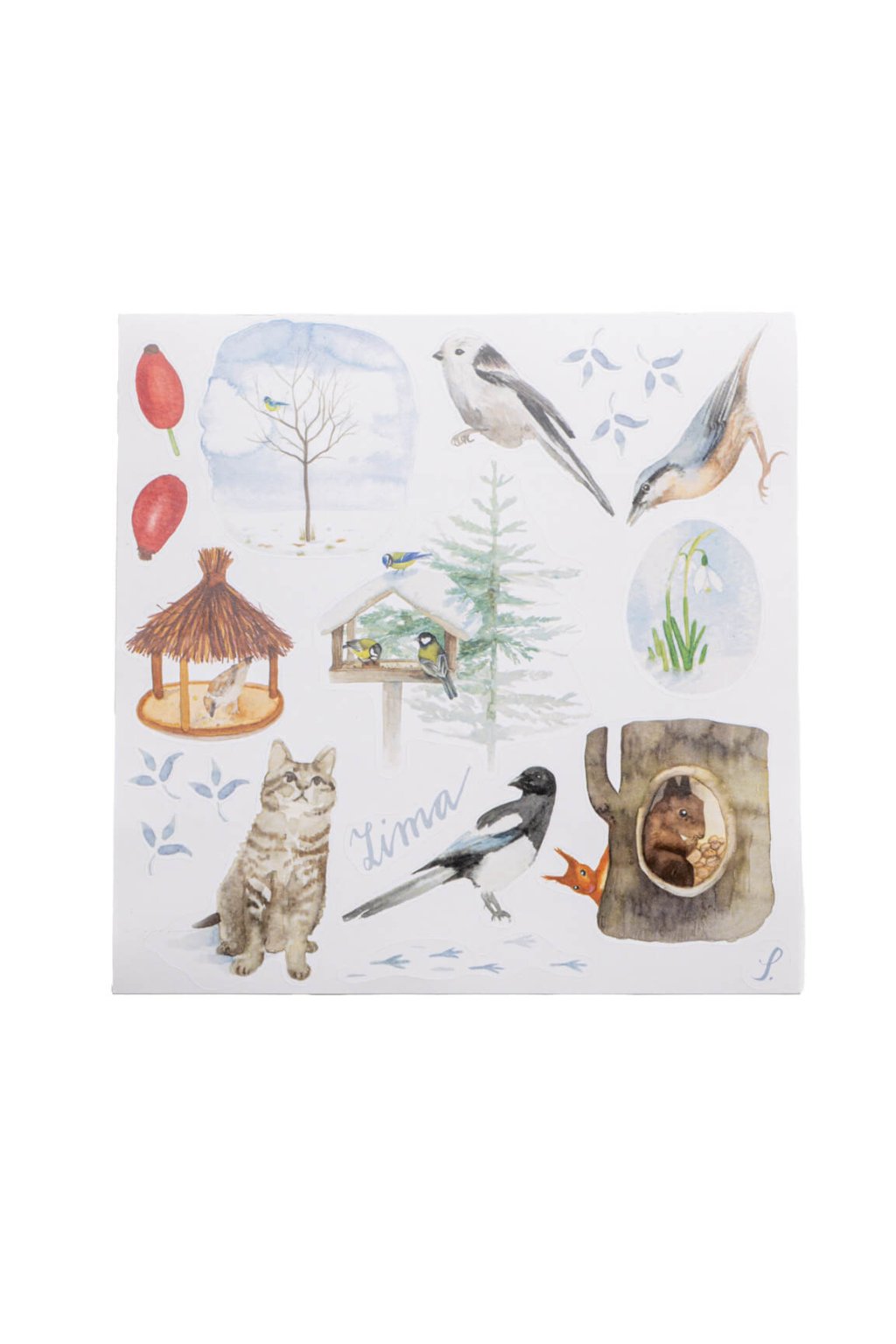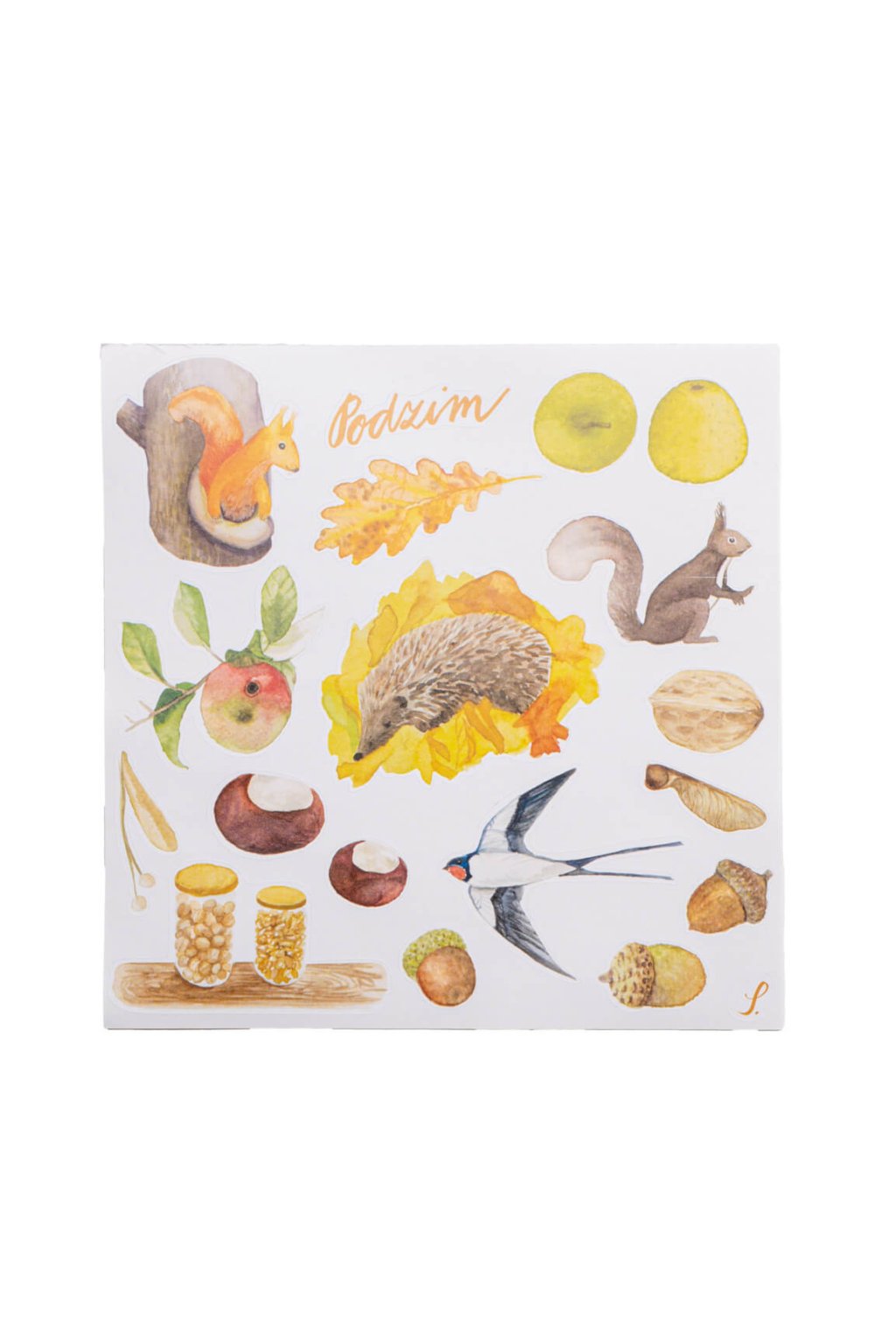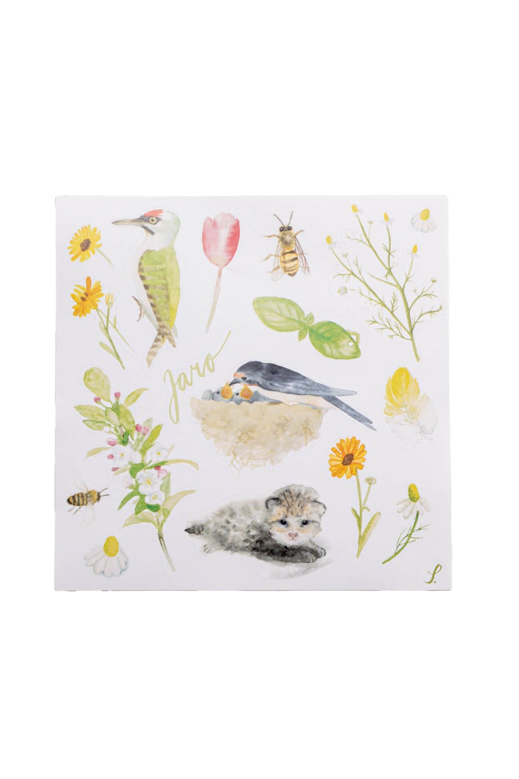 Každá nálepka je majstrovsky namaľovaná akvarelom a na hárku nálepiek nájdete ako rastliny, kvitnúce v danom období, tak aj drobný hmyz, zvieratá a vtáctvo.