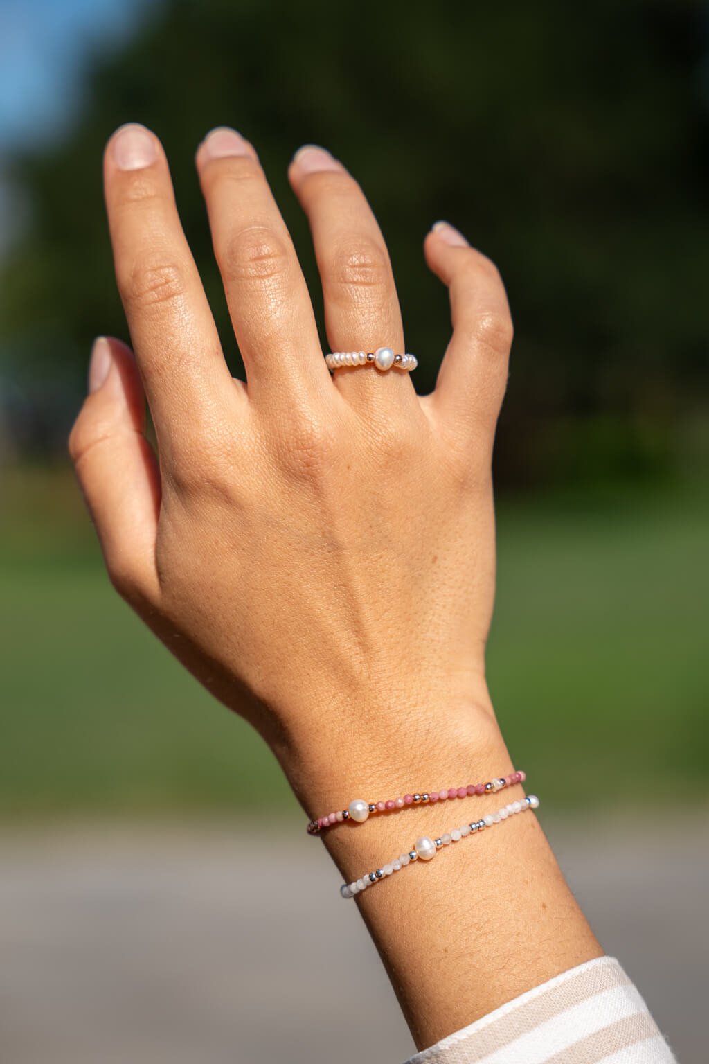 Náramok kombinujúci aventurín a riečne perly s pozlátenými komponentmi predstavuje dokonalú harmóniu elegancie a ružovej romantiky.