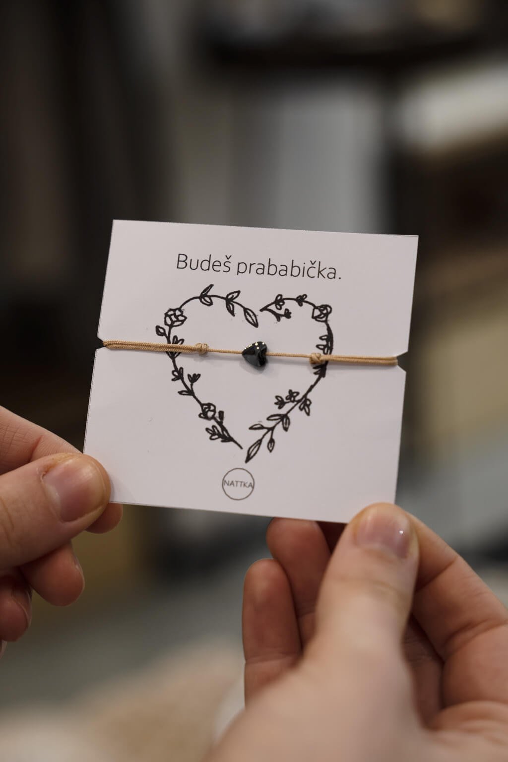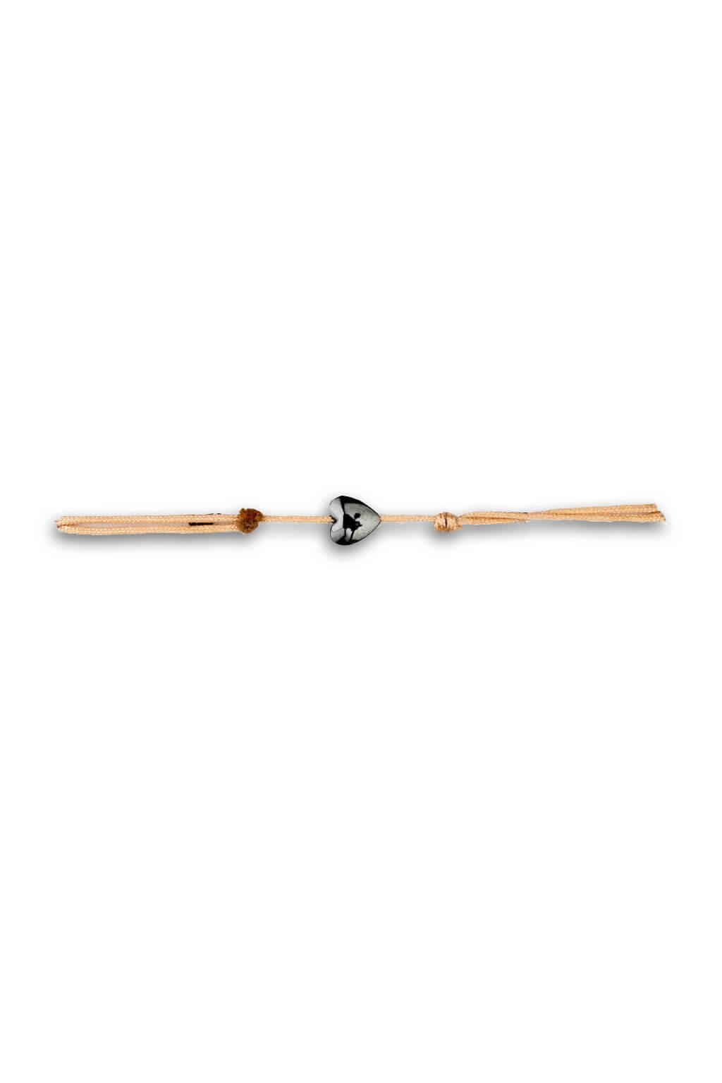 Decentný náramok s drobným hematitovým srdiečkom a šnúrkou pieskovej farby.