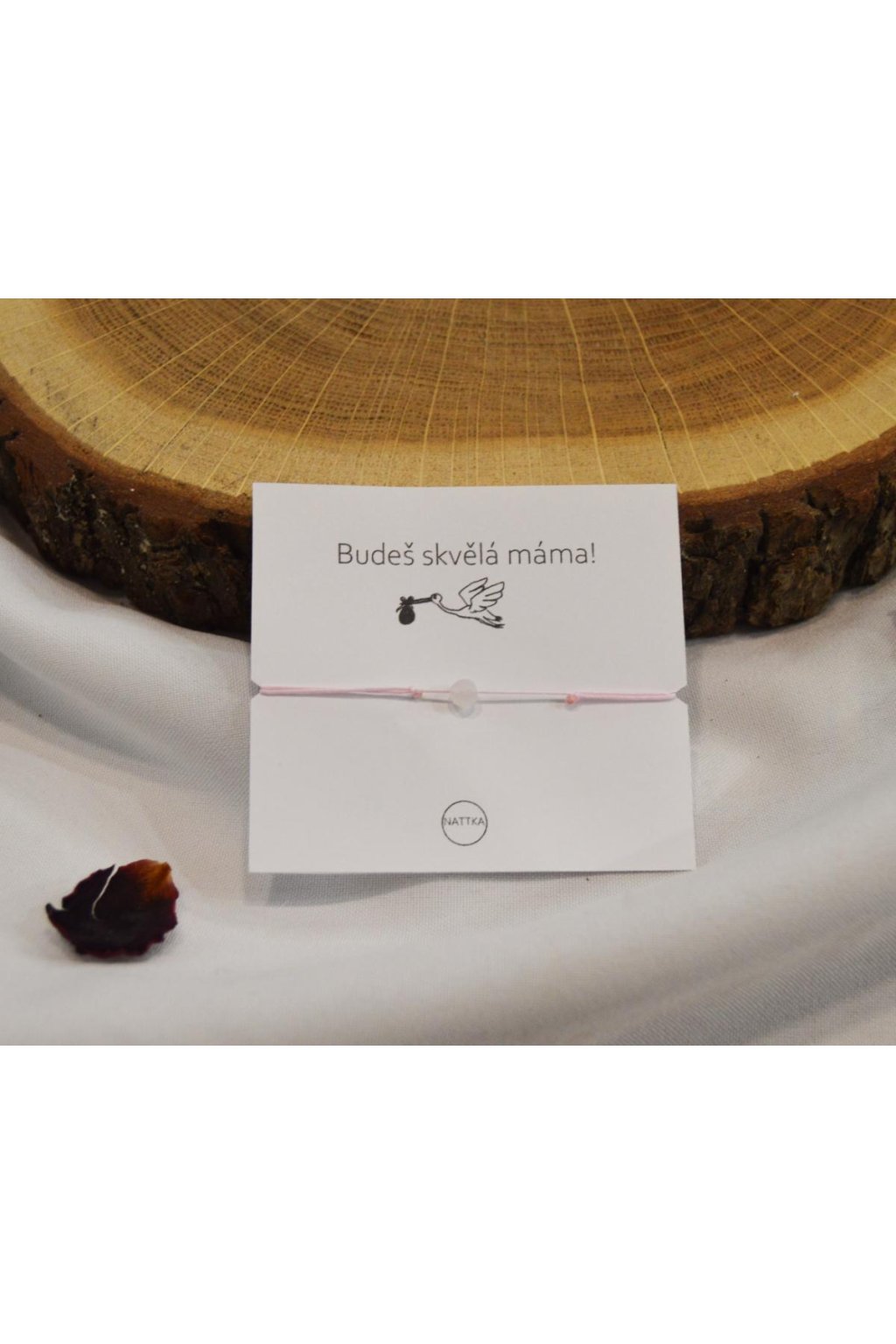 Šnúrkový náramok s venovaním pre budúcu mamičku. Materiál: ruženín, nylonová šnúrka.